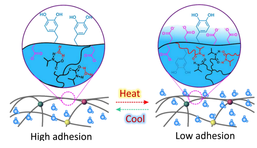 這項突破并非一蹴而就。周峰回憶,幾年前,團隊一直攻關(guān)高強韌黏附水凝膠材料,偶然發(fā)現(xiàn)一種材料在多次按壓后黏性驟降。“該現(xiàn)象引發(fā)了我們的極大興趣,經(jīng)過對材料的成分分析、機理驗證等,才知道原來在多次按壓以后,手部溫度傳遞到凝膠表面,致使凝膠發(fā)生相變,呈現(xiàn)低黏附態(tài)?!边@讓團隊意識到,溫度可能是調(diào)控黏附性能的鑰匙。