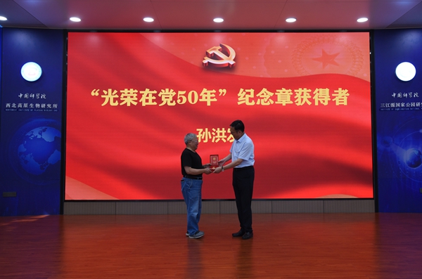 會議第二階段,在雄壯的國歌聲中,西北高原所召開慶祝建黨103周年表彰大會。楊勇剛宣讀了《中共中國科學院西北高原生物研究所委員會關于表彰先進黨支部、優(yōu)秀共產(chǎn)黨員和優(yōu)秀黨務工作者的決定》。首先,所長陳世龍向孫洪發(fā)同志頒發(fā)“光榮在黨50年”紀念章,代表所黨委向孫洪發(fā)同志表示祝賀,并對他多年來為黨的事業(yè)盡心竭力、無私奉獻致以崇高的敬意。