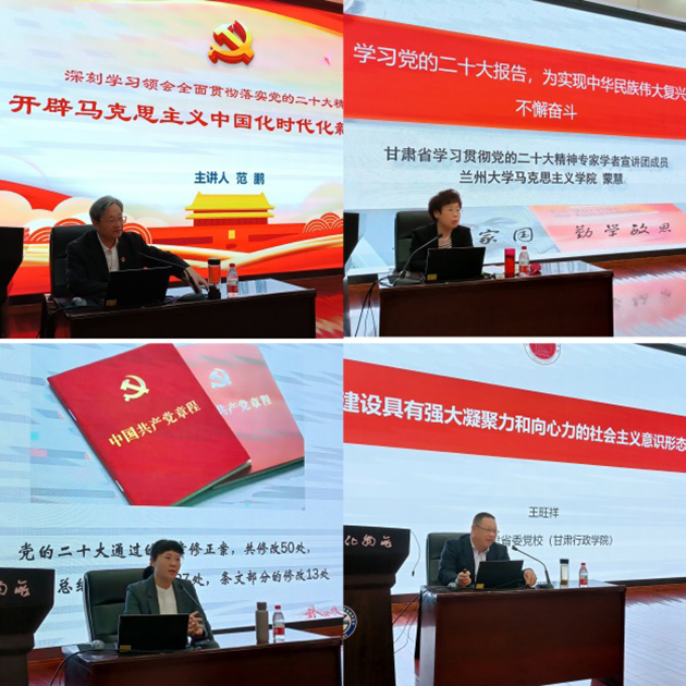 中共甘肅省委黨校文史教研部主任王旺祥教授,甘肅省委專家學(xué)者宣講團(tuán)成員、中共甘肅省委黨校黨的建設(shè)與領(lǐng)導(dǎo)科學(xué)教研部主任高璐佳,甘肅省學(xué)習(xí)貫徹黨的二十大精神專家學(xué)者宣講團(tuán)成員、蘭州大學(xué)馬克思主義學(xué)院蒙慧教授,甘肅省委專家學(xué)者宣講團(tuán)成員、蘭州大學(xué)范鵬教授分別應(yīng)邀作了題為“建設(shè)具有強(qiáng)大凝聚力和向心力的社會主義意識形態(tài)”“黨的二十大黨章修改的重點(diǎn)內(nèi)容及其重大深遠(yuǎn)歷史意義”“學(xué)習(xí)黨的二十大報(bào)告,為實(shí)現(xiàn)中華民族偉大復(fù)興不懈奮斗”“深刻學(xué)習(xí)領(lǐng)會全面貫徹落實(shí)黨的二十大精神 開辟馬克思主義中國化時(shí)代化新境界”的報(bào)告。
