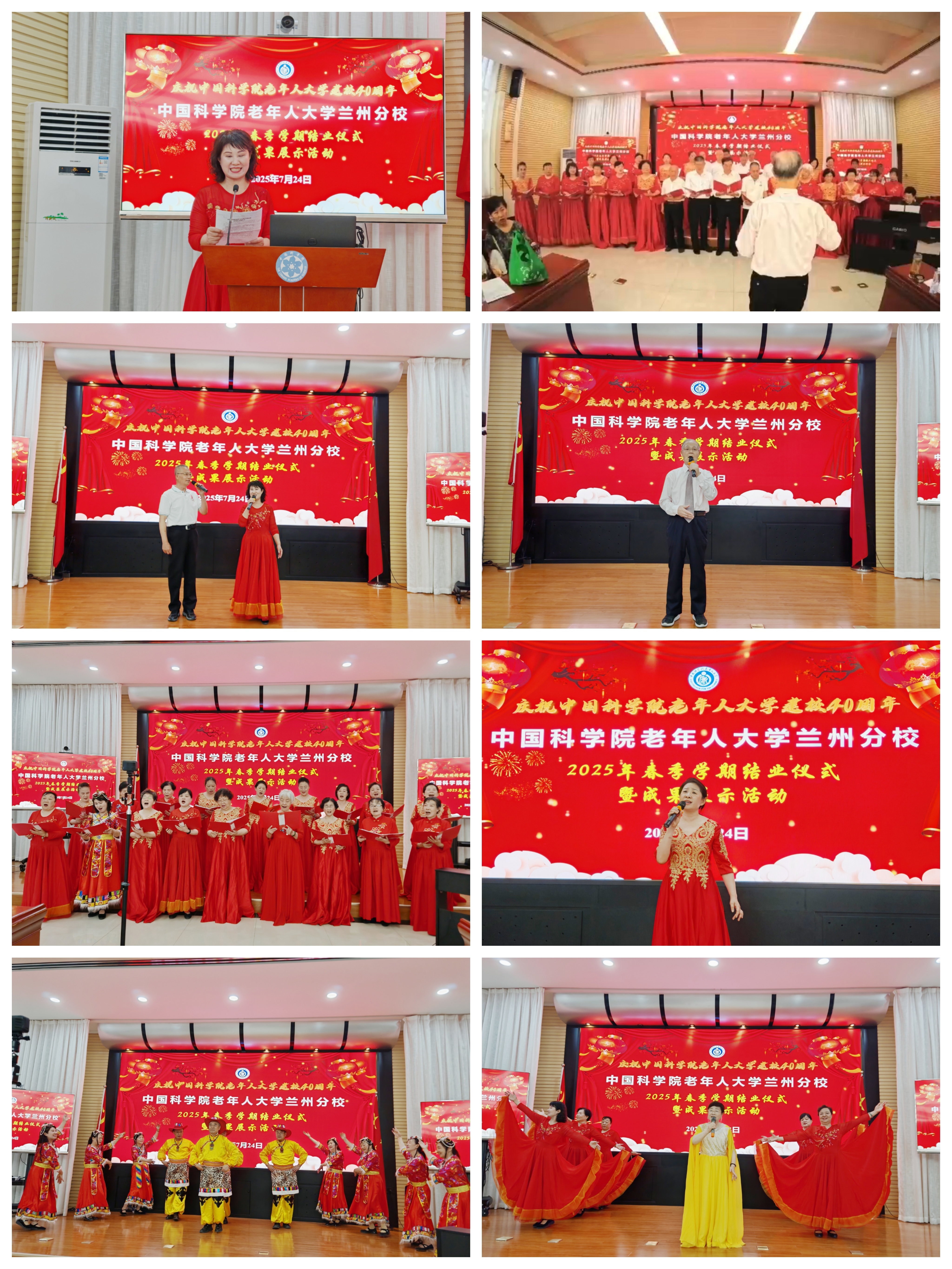 隨后,教學成果展演將活動推向高潮。學員們以飽滿激情演繹了《我愛你中國》《春風十萬里》兩首經典合唱,唱響愛國情懷與時代韻律。男女聲對唱《你在我心里》、男聲獨唱《感恩》、展現民族風情的舞蹈《甘南草原美》、婉轉悠揚的女聲獨唱《蘆花》《節(jié)日歡歌》以及女聲小合唱《唱支山歌給黨聽》《再唱洪湖水》等節(jié)目輪番登場,充分展現了老年學員昂揚的精神風貌和豐碩的學習成果。西北高原所教學點合唱班也通過視頻方式展示了《唱支山歌給黨聽》《映山紅》的表演成果。此外,書畫班、攝影班和手工班學員的精心創(chuàng)作也在現場進行了展示。