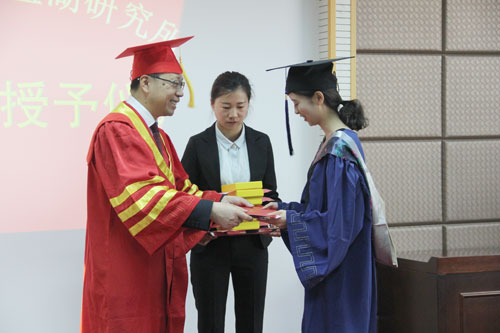 畢業(yè)典禮在與會人員集體奏唱國歌聲中拉開序幕。主持工作的副所長吳志堅代表所領導發(fā)表講話,對2017屆畢業(yè)生表示衷心地祝賀,對今后的發(fā)展提出了四個:思想好、身體好、學習好、工作好。殷切期望畢業(yè)生能有一個積極、樂觀、不斷進取的健康思想,能夠積極進行體育鍛煉,保持健康身體,能夠在今后的道路上不斷學習,成為今后工作崗位上的棟梁之才,能夠積極應對工作中遇到的各種情況,對工作富有熱情。吳志堅還宣讀了中國科學院大學丁仲禮校長給2017屆畢業(yè)生的一封信,希望畢業(yè)生擔負起丁仲禮校長所給予的厚望。