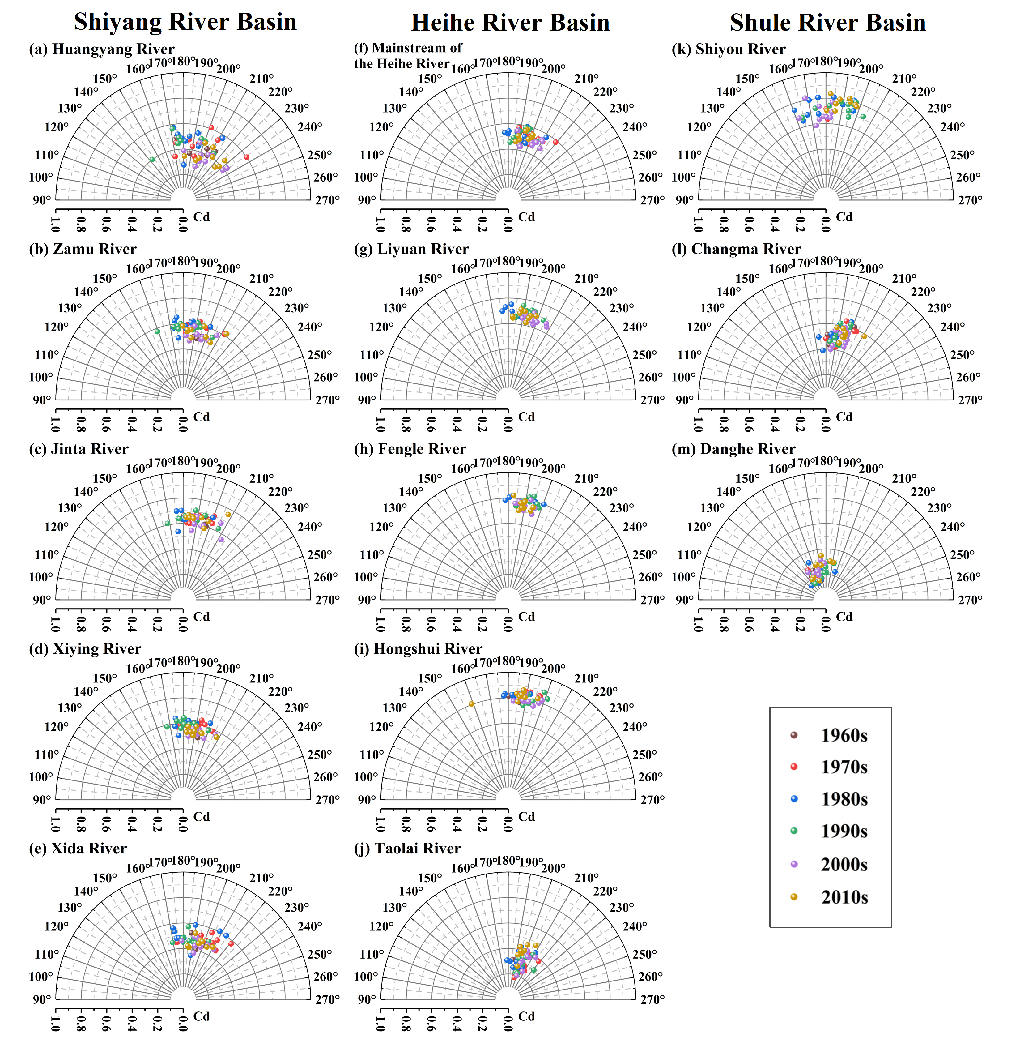 研究發(fā)現(xiàn):1、討賴河及其以西河流(除石油河外)出山徑流年內(nèi)分配不均勻性呈上升趨勢,相反,以東河流呈下降趨勢,但Cv和Cr值仍然很高(圖1);2、石羊河流域年內(nèi)徑流集中期在年際分布上具有相對離散的特征,1965-2018年期間,石羊河流域徑流年內(nèi)集中期極差值均在40°以上,且黃羊河集中期極差值達到93°,即集中期出現(xiàn)時間相差三個月左右。黑河流域集中期極差值均小于45°,則相對集中,梨園河、豐樂河、洪水河的徑流年內(nèi)集中度均大于0.6。疏勒河流域的集中度與集中期具有明顯差異,石油河集中期主要分布在160°~200°(約6月末至8月初),集中度分布在0.6~0.9;昌馬河集中期主要分布在180°~200°(7月初至8月初),集中度分布在0.4~0.7;黨河集中期主要分布在130°~200°(5月末至8月初),集中度分布在0.1~0.4。在2000年后,三個流域的集中期均有所后移(圖2)。總體上相對變化幅度由大到小為:洪水河>豐樂河>石油河>梨園河>金塔河>雜木河>西營河>西大河>黃羊河>黑河干流>昌馬河>討賴河>黨河(圖3);3、梨園河及以東河流年內(nèi)徑流分配曲線的峰度系數(shù)均小于零,相對于正態(tài)分布來說,峰面更加平緩,年內(nèi)極端徑流出現(xiàn)的概率更小;以西(除黨河外)峰度系數(shù)均大于零,相對于正態(tài)分布來說,峰面更加陡峭,徑流更加集中,年內(nèi)極端徑流出現(xiàn)的概率更高(圖4)。相關(guān)研究結(jié)果對河西走廊水資源的規(guī)劃和管理具有實際意義,并為預(yù)測區(qū)域水資源未來變化提供了科學(xué)參考。