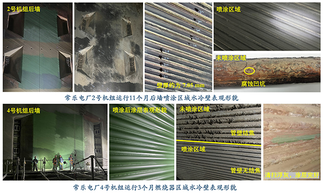 中國科學(xué)院蘭州化學(xué)物理研究所低碳能源材料組高祥虎研究員團(tuán)隊近年來圍繞電站關(guān)鍵材料,專注于大型電站鍋爐輻射受熱面防護(hù)與節(jié)能增效關(guān)鍵技術(shù)研究。團(tuán)隊研發(fā)的納米高熵防護(hù)與節(jié)能增效陶瓷涂層,突破了陶瓷材料防結(jié)焦、耐高溫腐蝕、紅外增效、高導(dǎo)熱率、熱膨脹系數(shù)可調(diào)等關(guān)鍵技術(shù),同時具有降低煤耗、提高煤種適應(yīng)性的多功能特點(diǎn),可滿足大型調(diào)峰電站及其他常規(guī)電站的使用需求。在常樂電廠的大力支持下,該材料先后在其2號、4號機(jī)組開展應(yīng)用。在爐膛服役1年后,使用了涂層材料的水冷壁管壁表面光滑致密、無結(jié)焦、附著物易清除、未出現(xiàn)凹坑和管壁減薄等腐蝕情況,表現(xiàn)出優(yōu)異的耐高溫腐蝕和防結(jié)焦性能。經(jīng)西安熱工研究院有限公司現(xiàn)場檢測,管壁厚度較噴涂前無明顯變化。對照相同區(qū)域未噴涂防護(hù)涂層的水冷壁表面均出現(xiàn)明顯的腐蝕凹坑,并附著有褐色的腐蝕產(chǎn)物。