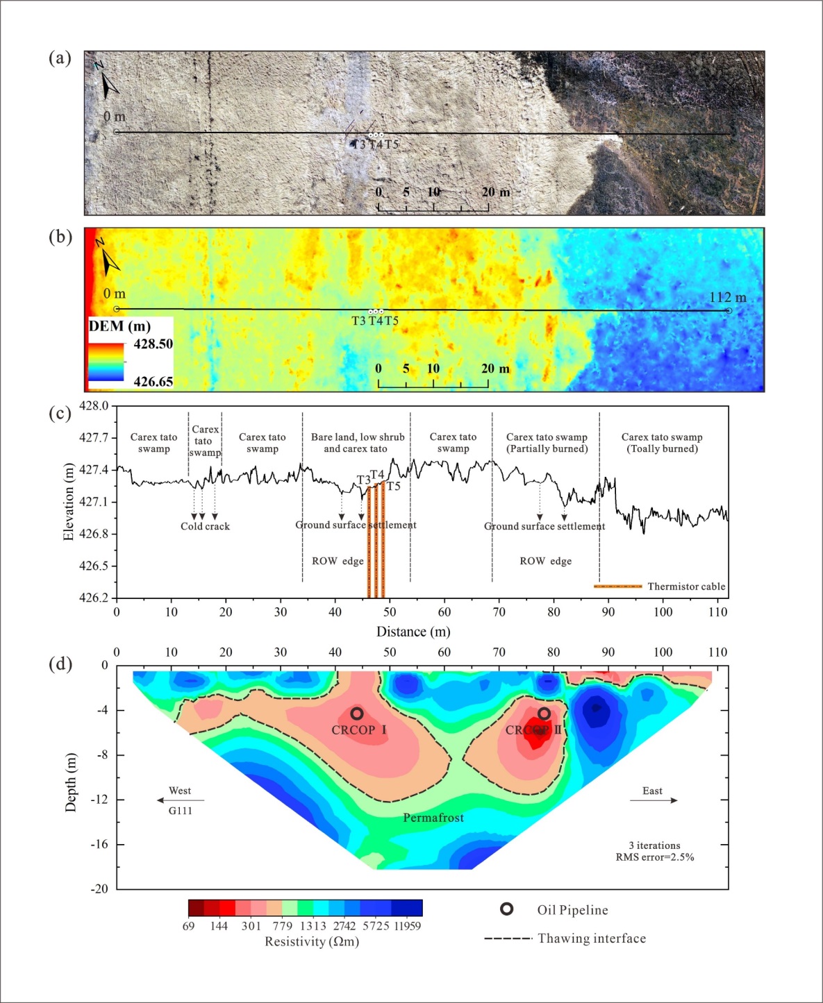 西北研究院科研團隊利用中俄原油管道沿線典型場地的油溫、地溫、管道位移、地表形變、物探(ERT)和無人機影像數據,分析了管道周圍多年凍土融化、地表變形、植被變化、積水和冰椎分布等,并對多年凍土融化與地表形變之間的協(xié)變性進行了系統(tǒng)研究。