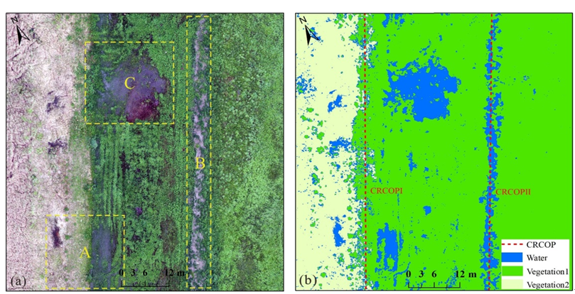 圖3 管道沿線積水分布?。╝)無人機正射影像?。╞)影像監(jiān)督分類結果