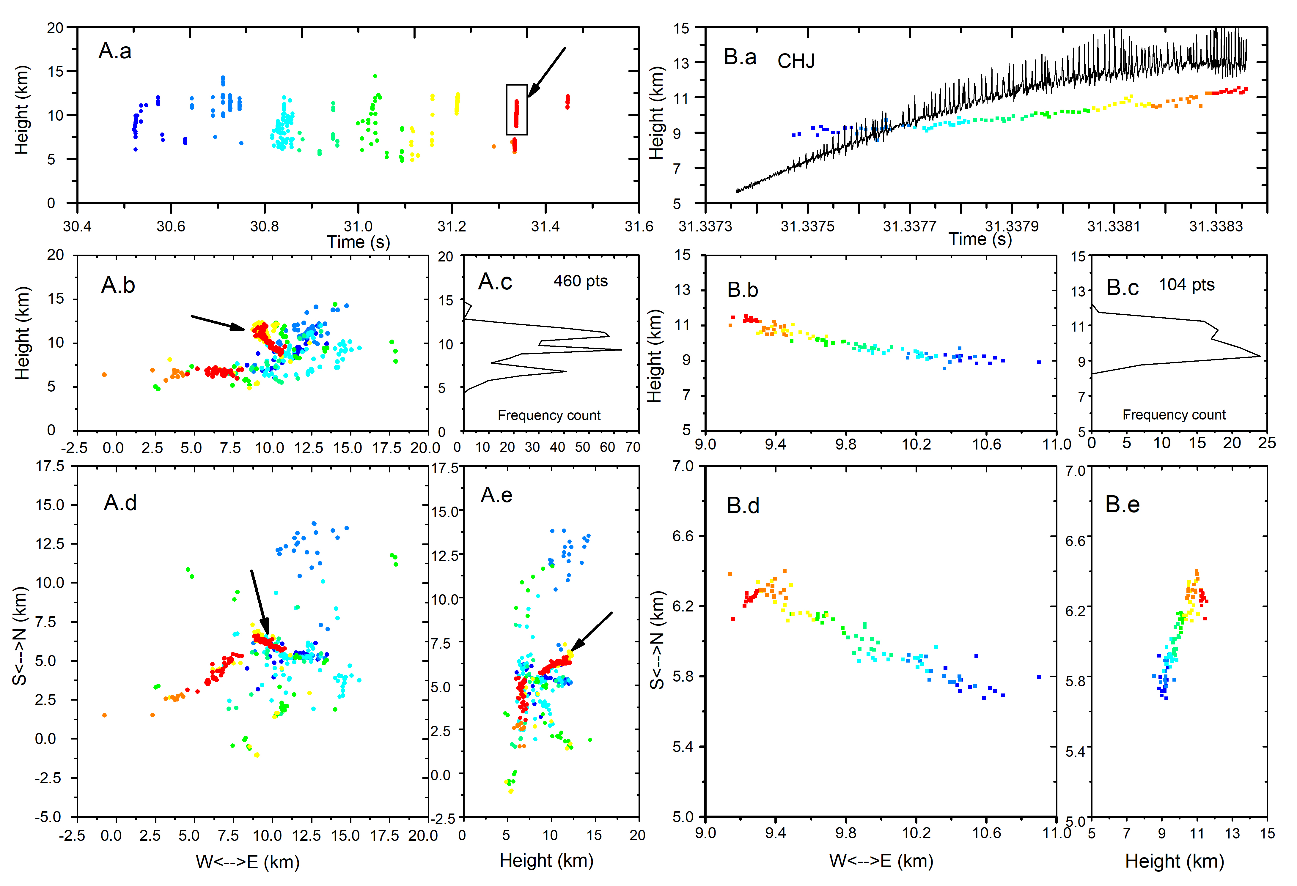圖 1. 云閃(A)及其規(guī)則脈沖爆發(fā)序列 (RPBs,B) 的三維觀測?。╝) 高度-時間關(guān)系圖,以及在CHJ站測量的LF/VLF電場,該站作為坐標(biāo)原點;(b) 東-西方向的垂直投影;(c) 輻射源數(shù)量及高度統(tǒng)計(RPBs 在 1 毫秒內(nèi)產(chǎn)生104脈沖);(d ,e) 平面圖和輻射源的南-北方向垂直投影(圖A出自 Fan 等 ,2018)。
