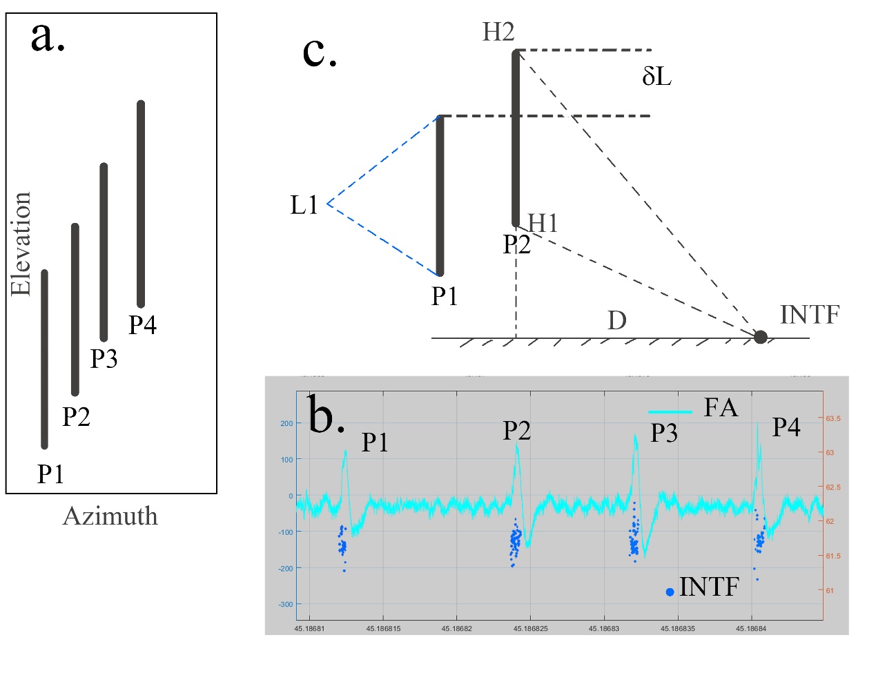 圖2. VHF干涉儀(Fan et al.,2023a;2023b)對規(guī)則脈沖爆發(fā)序列中連續(xù)脈沖的二維觀測結(jié)果,顯示這些脈沖比正常的直竄先導(dǎo)速度更快,并且從一個脈沖到另一個脈沖之間重疊較強?。╝)。從平面距離 D = 5.8 公里和干涉儀仰角的差異(例如,60.5° 和 60°),可以得出脈沖的 VHF輻射源的垂直范圍約為 205 米?。╟)。這一現(xiàn)象發(fā)生在約 2 微秒的時間間隔內(nèi),對應(yīng)的速度約為 108 米/秒。脈沖代表的擊穿速度遠(yuǎn)高于已知的閃電先導(dǎo)通道發(fā)展速度。