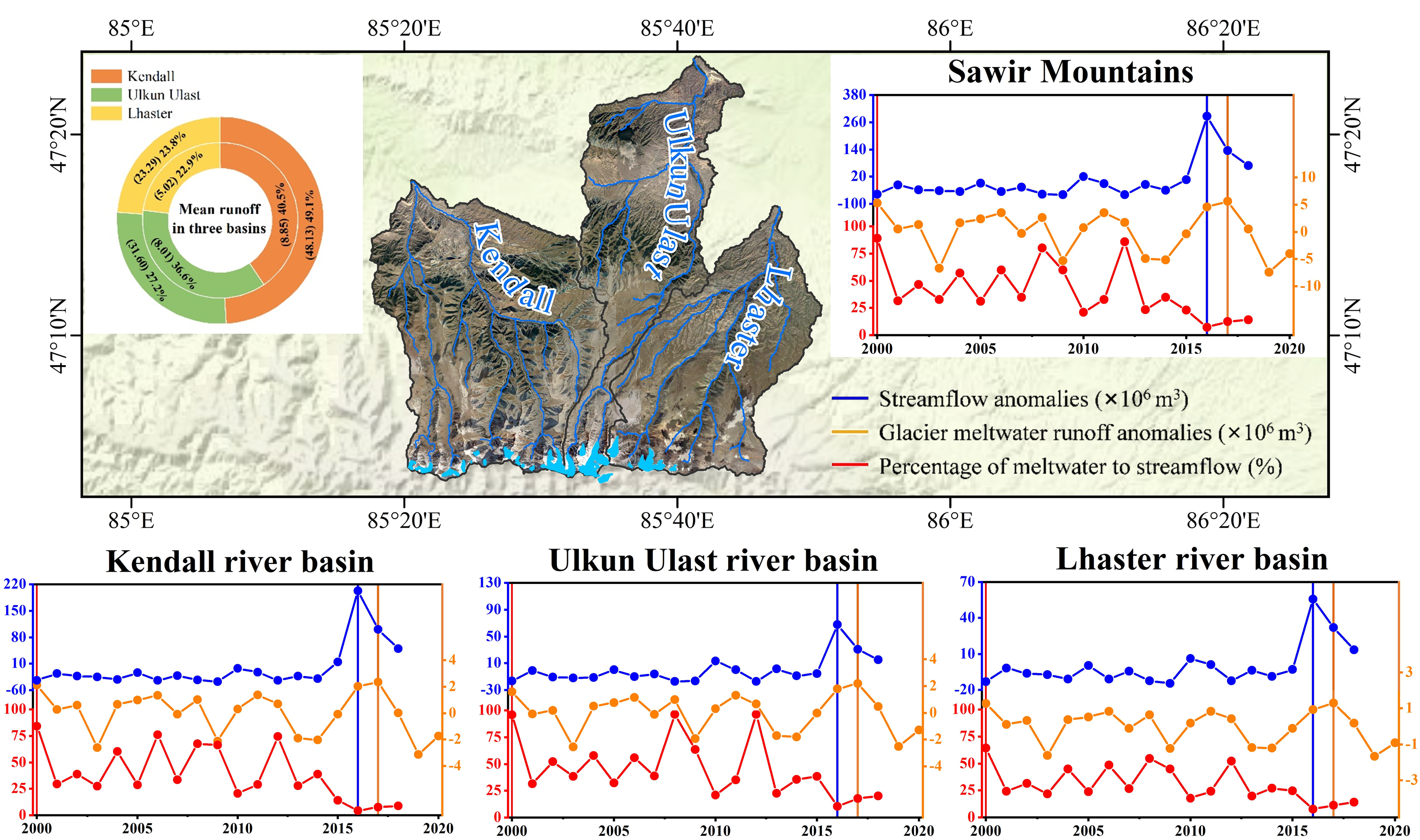 研究結(jié)果表明,2000年至2020年薩吾爾山冰川反照率以0.015?。?0a)-1的速率顯著降低;三種模擬方案均顯示,該區(qū)域冰川經(jīng)歷持續(xù)的物質(zhì)損失,年均物質(zhì)平衡為-1.01 m w.e.(圖2);同時段內(nèi)該區(qū)域年均冰川融水徑流為22×106 m3,冰川融水徑流占比約為25.81%。所屬三個子流域(烏勒昆烏拉斯特河、拉斯特河和肯德爾河)冰川融水徑流的貢獻(xiàn)率分別為31.37%、22.51%和19.27%(圖3)。