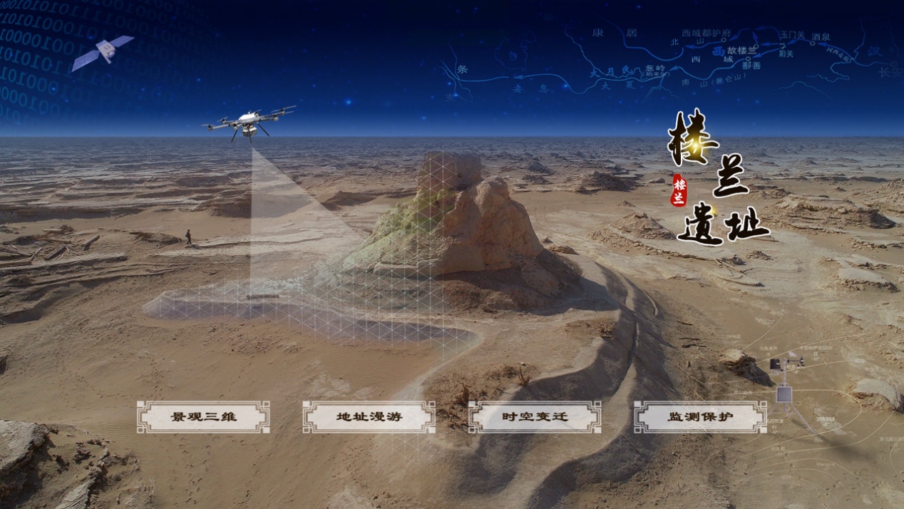 系統(tǒng)平臺(tái)通過(guò)“景觀三維、遺址漫游、時(shí)空變遷、監(jiān)測(cè)保護(hù)”四個(gè)功能模塊,實(shí)現(xiàn)了衛(wèi)星宏觀遙感、無(wú)人機(jī)精細(xì)測(cè)繪、地面實(shí)時(shí)監(jiān)測(cè)等綜合技術(shù)在樓蘭遺址的協(xié)同應(yīng)用。能夠通過(guò)精細(xì)二三維實(shí)景地圖模型客觀真實(shí)、身臨其境地展示遠(yuǎn)在千里之外的神秘古城;通過(guò)歷史地圖和衛(wèi)星遙感數(shù)據(jù)的空間一體化,提供了一套研究樓蘭古跡時(shí)空演變的空間數(shù)據(jù)庫(kù);利用衛(wèi)星、無(wú)人機(jī)和地面?zhèn)鞲衅骷夹g(shù),實(shí)現(xiàn)了“天空地”一體化的樓蘭遺址生態(tài)環(huán)境因子系統(tǒng)監(jiān)測(cè)與分析。