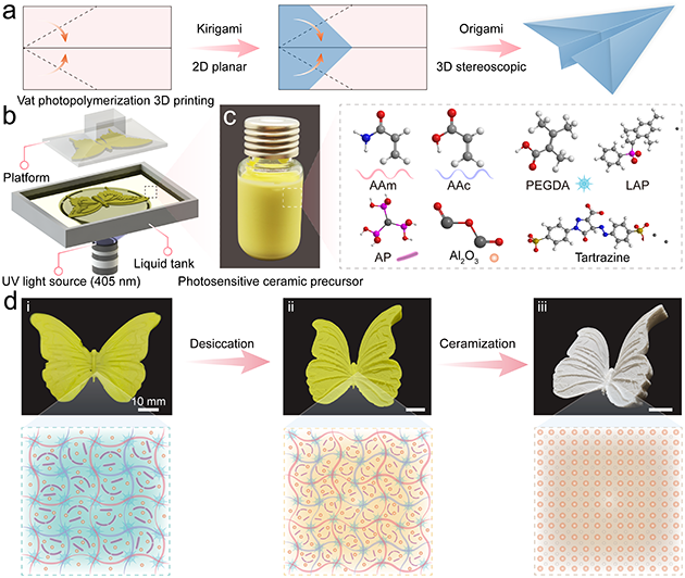 該團隊受折紙/剪紙藝術啟發(fā),以水性無機粘結劑磷酸二氫鋁(AP)溶膠為水凝膠單體分散介質,將水凝膠單體和納米陶瓷粉體混合來制備光敏性水凝膠陶瓷漿料;利用光固化3D打印獲得具有優(yōu)異的延展性、形狀適應性、抗疲勞性且可二次變形的水凝膠柔性骨架;依次經過脫水干燥、低溫脫脂和高溫燒結等步驟,實現了具有超低收縮、高陶瓷產率和形狀保真度的懸空大跨度陶瓷結構(圖1)。設計的柔性水凝膠基陶瓷前驅體能夠實現從平面形狀到3D立體結構的轉變,突破了傳統(tǒng)硬質/脆性陶瓷前驅體來制造復雜陶瓷結構的局限。