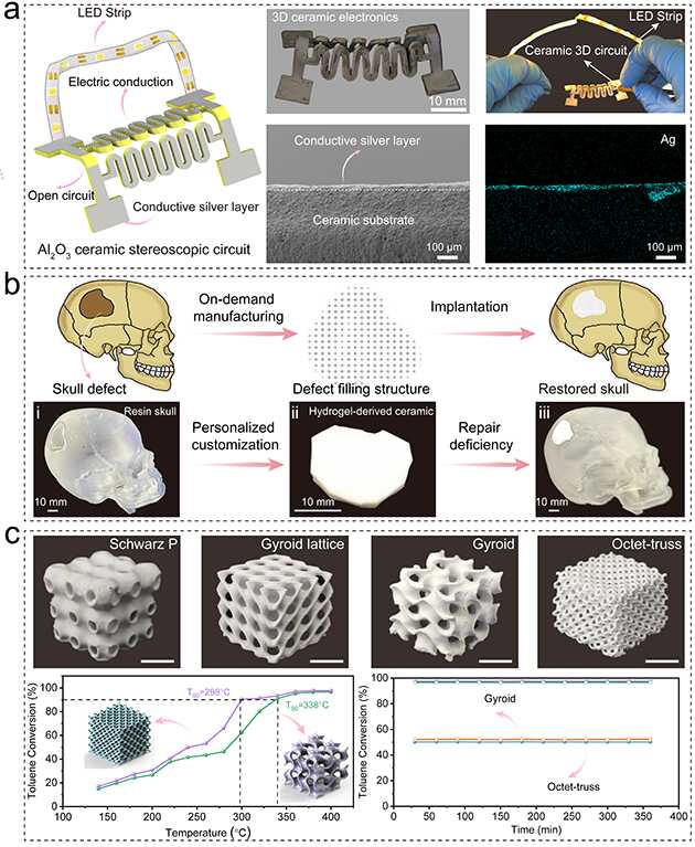 基于此方法,研究人員還可制造無支撐且大跨度的陶瓷三維電路,且這種陶瓷三維電路能很好地點亮LED燈帶。此外,利用水凝膠柔性骨架的可變形性,可按需或個性化制造具有顱骨缺損形狀的陶瓷結構來實現骨缺陷部位修復。制造的陶瓷結構還可結合表面改性策略創(chuàng)造性設計制備高性能的復雜結構催化陶瓷器件,具有優(yōu)良的催化活性和穩(wěn)定性。研究人員還進一步拓展了這種方法在三維電路、生物醫(yī)用及功能催化領域的潛在應用(圖3)。