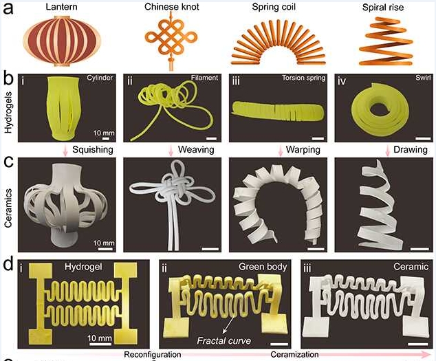 圖2. 水凝膠柔性前驅體輔助制造的無支撐、大跨度復雜結構陶瓷器件