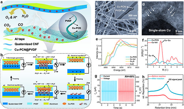近日,研究團(tuán)隊(duì)與新加坡科學(xué)技術(shù)研究局的科研人員合作,在界面電荷利用方面做出新突破,利用單原子銅錨定的聚合物碳氮化物催化劑和季銨化纖維素納米纖維成功實(shí)現(xiàn)了接觸電催化CO2還原,生成CO的法拉第效率達(dá)到96.24?。?/span>。季銨化纖維素納米纖維由于含豐富的羥基,可在高濕度環(huán)境中與水分子形成氫鍵,固定水分子并參與接觸帶電并發(fā)生氧化反應(yīng),導(dǎo)致氧氣和質(zhì)子的產(chǎn)生,參與觸電催化CO2還原過(guò)程。這種方法在低濃度CO2環(huán)境中能高效地將其轉(zhuǎn)化為CO,為減少大氣CO2排放和推進(jìn)化學(xué)可持續(xù)性策略提供了一種解決方案。
