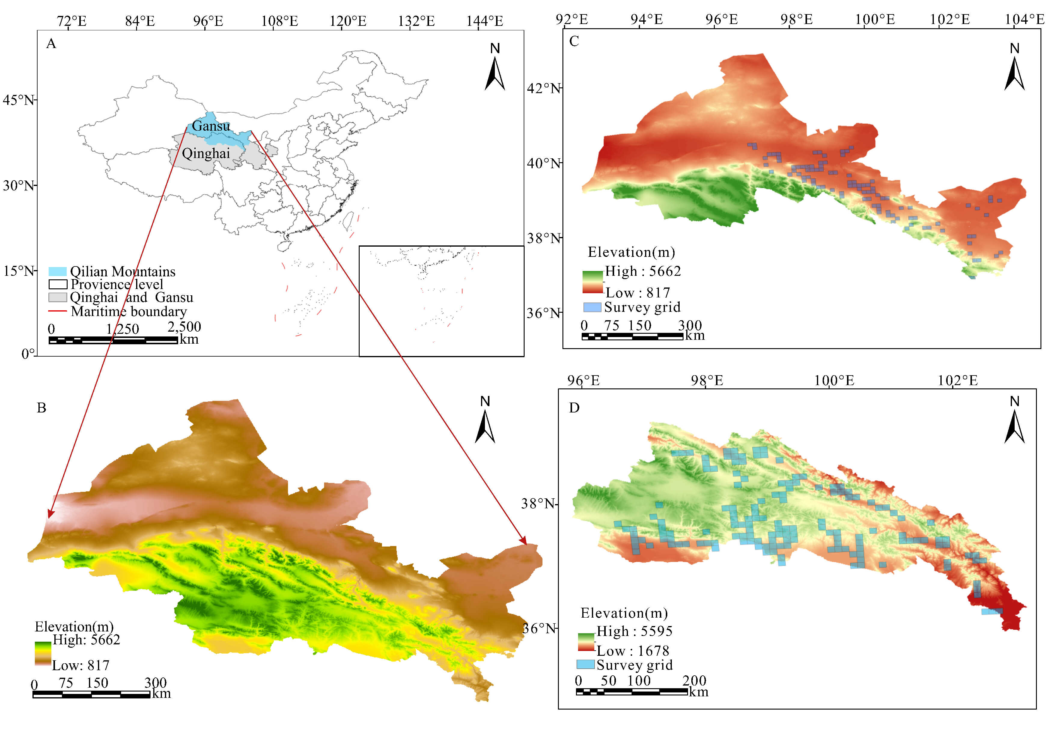 研究區(qū)域分布圖。(A)祁連山位置;(B) 祁連山海拔分布變化;(C) NSQM中鳥類調(diào)查網(wǎng)格海拔分布變化;(D) SSQM