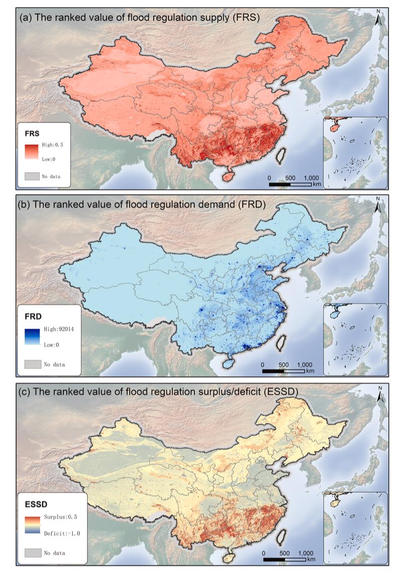 FRESF工具箱2號模塊的示例輸出,空間明確地繪制了我國2020年洪水調(diào)蓄生態(tài)系統(tǒng)服務(wù)的供給?。╝)、需求?。╞) 和赤字 (c)