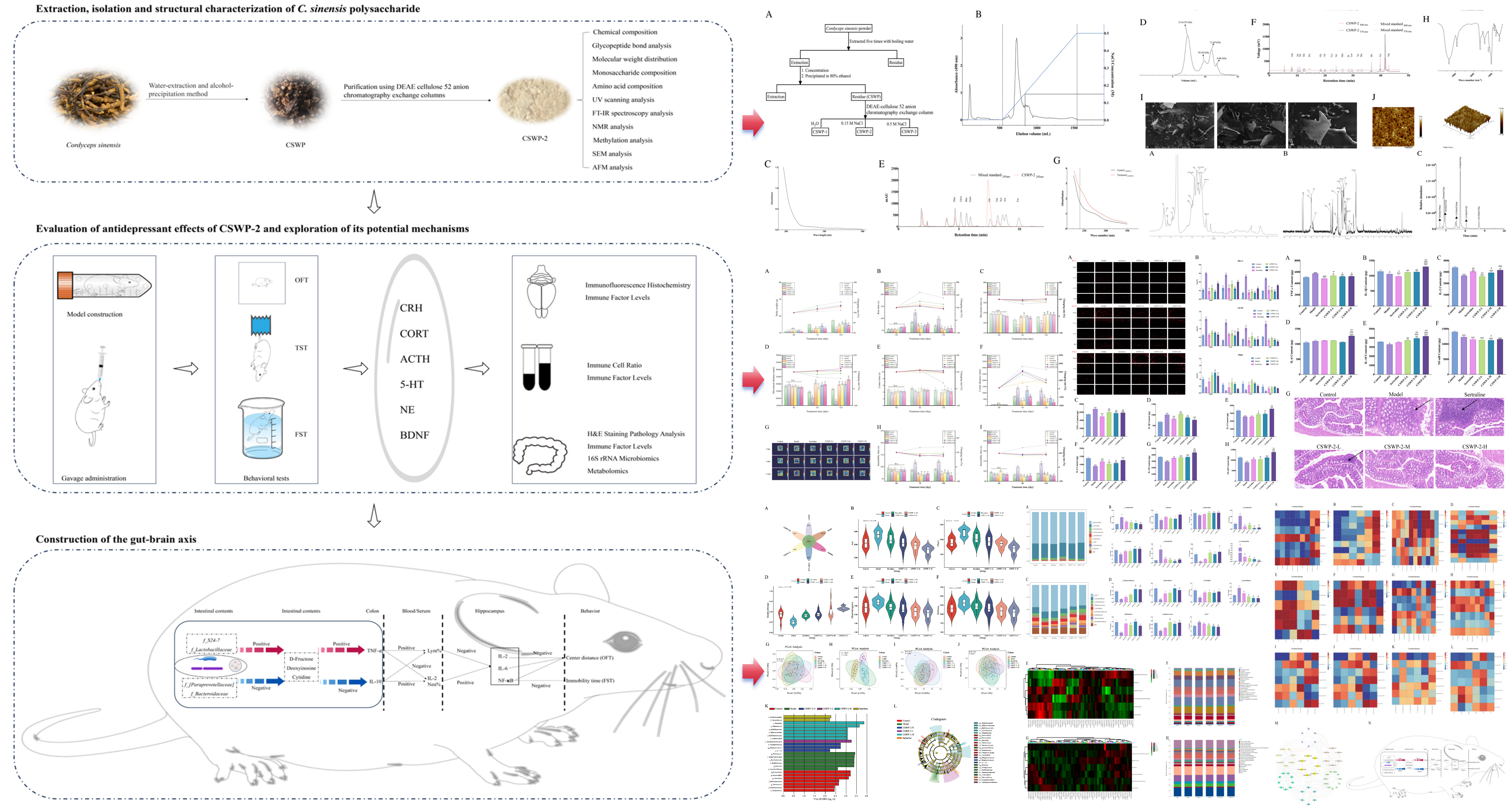中國科學(xué)院西北高原生物研究所高原藏藥資源質(zhì)控與藥理毒理評價研究團(tuán)隊(duì)采用水提醇沉法結(jié)合離子交換柱層析,從冬蟲夏草中得到一種CSWP-2多糖組分,隨后對其進(jìn)行組成、結(jié)構(gòu)和抗抑郁作用研究。結(jié)構(gòu)研究結(jié)果表明,CSWP-2主要是由1,4-linked ??-D-Glcp、1,4,6-linked ??-D-Glcp、??-1,6-Galf和??-1,6-Manp等糖基連接組成。抗抑郁作用研究結(jié)果表明,CSWP-2通過調(diào)整微生物群(f_S24-7,f_Lactobacillaceae,f_[Paraprevotellaceae]和 f_Bacteroidaceae)影響ABC轉(zhuǎn)運(yùn)體信號通路,導(dǎo)致代謝物(D-fructose,deoxyinosine和cytidine)水平變化,從而調(diào)節(jié)機(jī)體的免疫水平,最終改善小鼠的抑郁樣行為。該研究為冬蟲夏草及其多糖成分在免疫調(diào)節(jié)及抗抑郁藥品研發(fā)中提供科學(xué)依據(jù)。