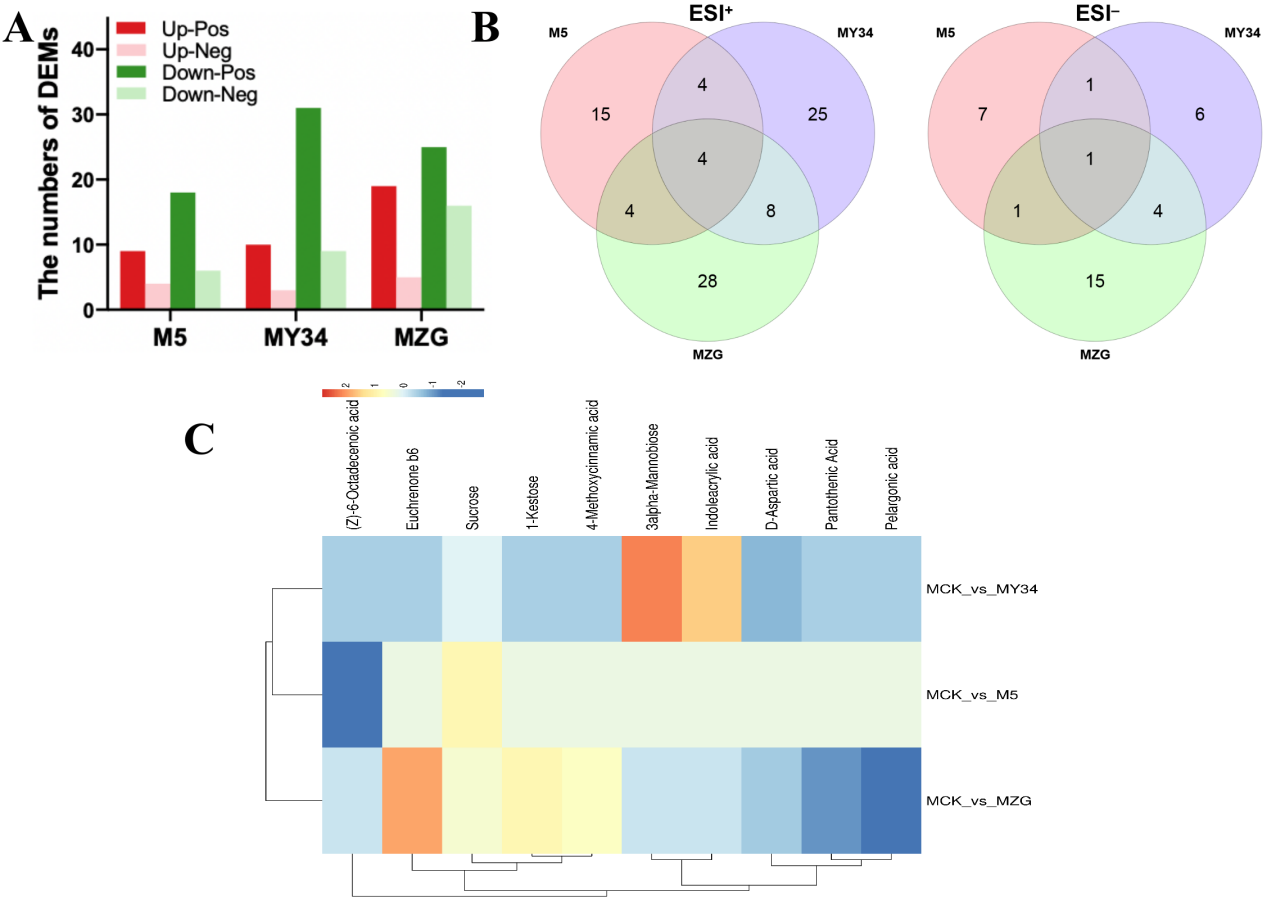 非靶代謝組結(jié)果表明,M5顯著積累蔗糖,而MZG和MY34分別顯著積累代謝物Euchrenone b6和甘露二糖。