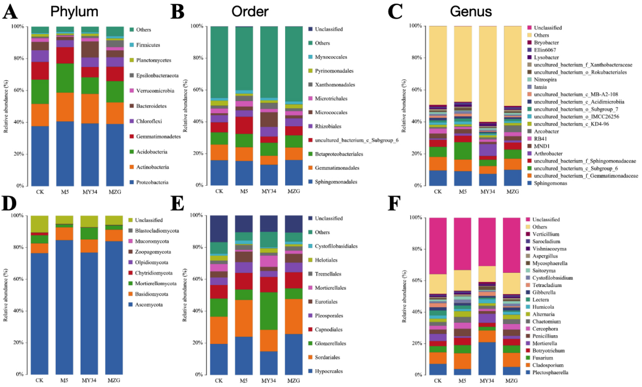 此外,根際微生物組結(jié)果表明,三種施用方式均不顯著改變微生物群落結(jié)構(gòu),但M5和MZG土壤中更易富集有益微生物,如青霉菌;而MY34更易富集嗜糖微生物,如Arthrobacter屬細(xì)菌和Plectosphaerella、Mortierella屬真菌。