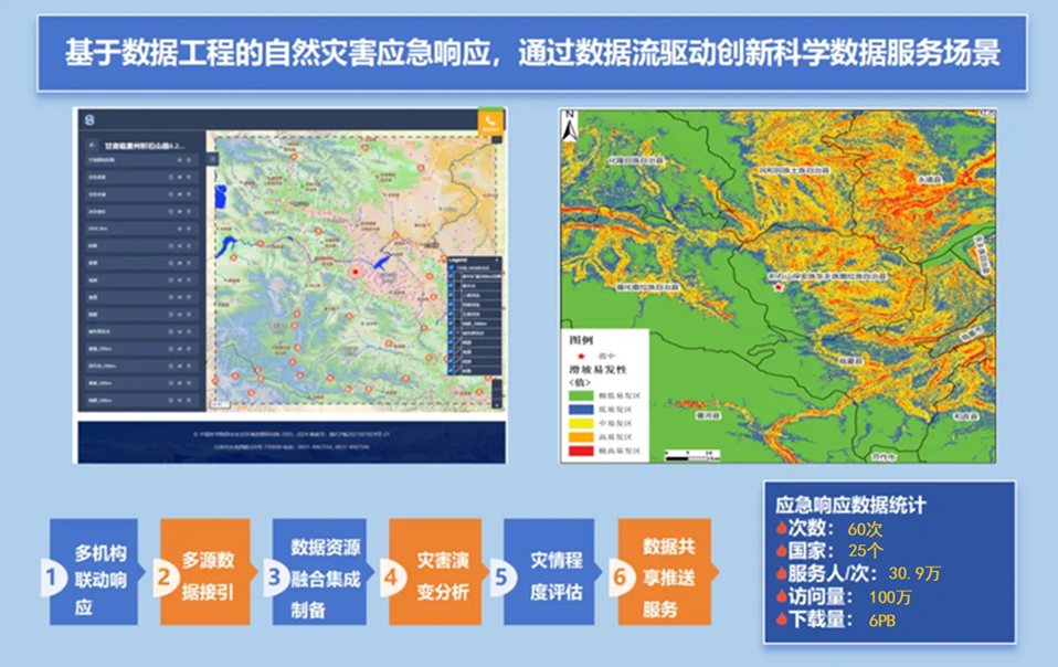 西北研究院國(guó)家冰川凍土沙漠科學(xué)數(shù)據(jù)中心和空天院國(guó)家對(duì)地觀測(cè)科學(xué)數(shù)據(jù)中心聯(lián)合國(guó)家地震科學(xué)數(shù)據(jù)中心、地面衛(wèi)星應(yīng)用中心、中科星圖、甘肅省科學(xué)數(shù)據(jù)中心、三和數(shù)碼等20多家機(jī)構(gòu),為解決國(guó)內(nèi)外地震、洪澇、滑坡等災(zāi)害應(yīng)急響應(yīng)處置中存在的災(zāi)情快速分析能力不足、精準(zhǔn)預(yù)測(cè)預(yù)警難等問(wèn)題,構(gòu)建了跨部門數(shù)據(jù)聯(lián)動(dòng)共享機(jī)制,創(chuàng)建了數(shù)據(jù)工程災(zāi)害應(yīng)急響應(yīng)服務(wù)平臺(tái),實(shí)現(xiàn)了多源數(shù)據(jù)接入、確權(quán)、治理、流通、聚合和應(yīng)用,提升了災(zāi)害應(yīng)急處置速度和能力。
