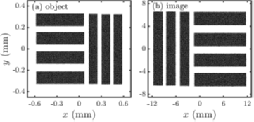 鑒于有源等離子體透鏡具有緊湊、聚焦梯度大、對稱聚焦、色差小的優(yōu)勢,科研人員將該透鏡成功應(yīng)用到高能電子成像中。從高能電子束在透鏡中的傳輸矩陣出發(fā),科研人員設(shè)計(jì)了一個(gè)總長為44.87cm、放大倍數(shù)為20的高能電子成像系統(tǒng),其點(diǎn)對點(diǎn)成像模擬結(jié)果如圖2所示。模擬結(jié)果表明:該系統(tǒng)的成像分辨率可以達(dá)到亞微米量級(jí),相較于基于電磁四極鐵的全長為5m(放大倍數(shù)為10)的成像系統(tǒng)十分緊湊。