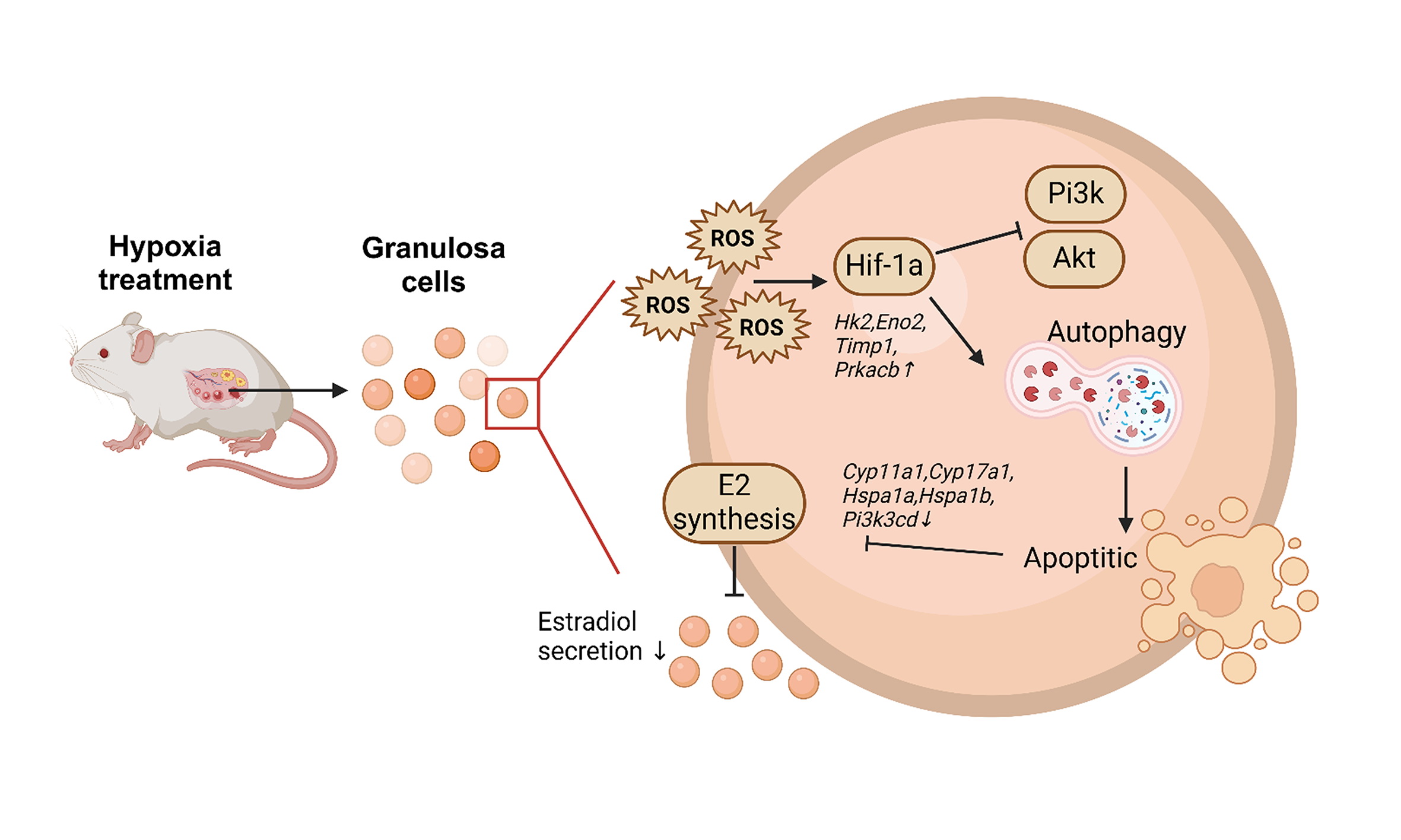 文章模式圖:胚胎期低氧誘導成年卵巢顆粒細胞的Hif1a激活和自噬