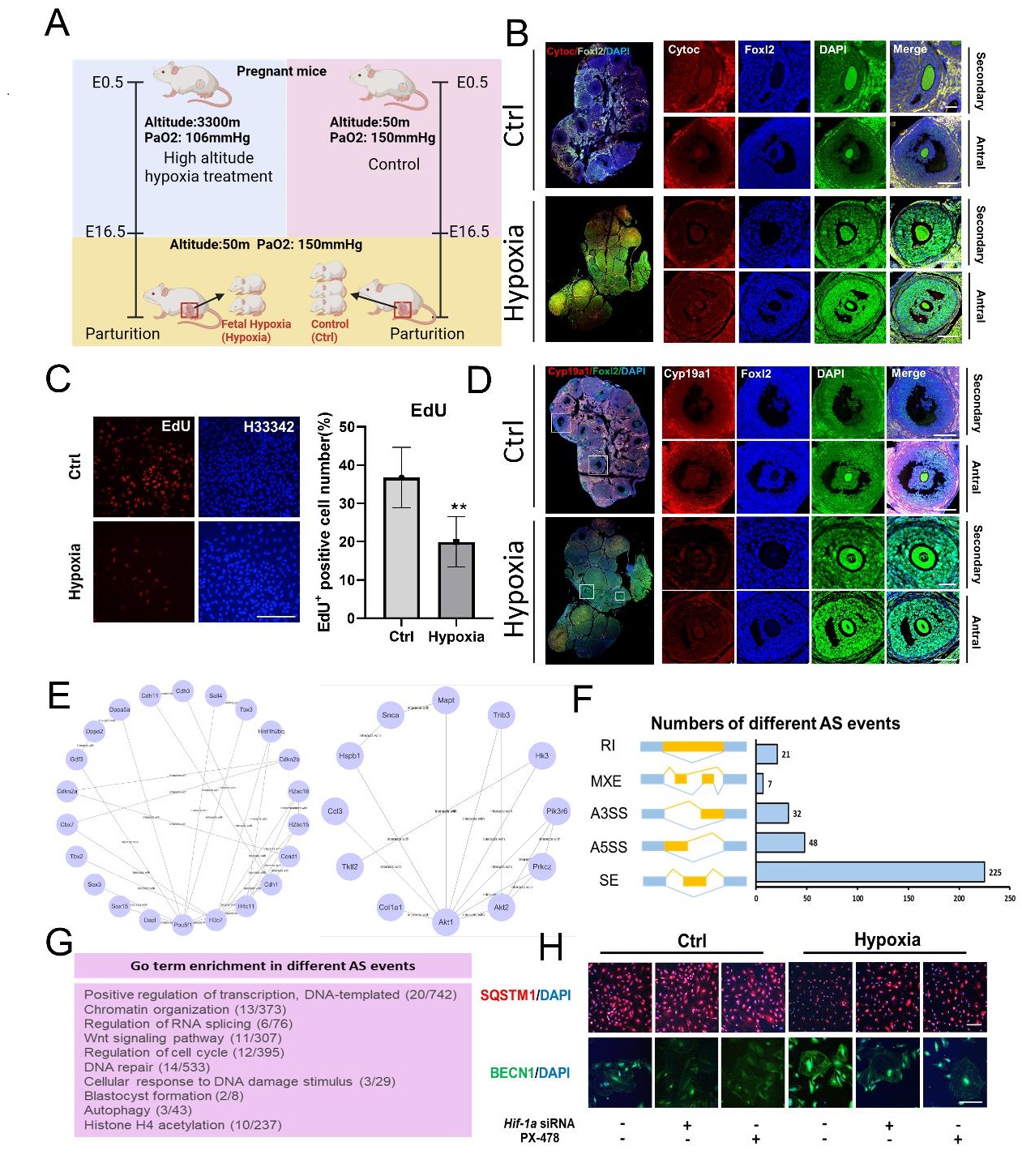 文章代表圖:A:胚胎期低氧模型建立示意圖;B:細胞色素C免疫熒光染色;C:體外細胞培養(yǎng)EdU細胞增殖活性檢測;D:雌激素合成轉(zhuǎn)化關鍵酶Cyp19a1免疫熒光染色;E:轉(zhuǎn)錄因子PPI富集分析圖;F:不同類型可變剪切差異統(tǒng)計;G不同可變剪切事件發(fā)生基因的Go富集分析;H體外實驗通過轉(zhuǎn)染Hif-1a SiRNA 和抑制劑添加檢測自噬相關蛋白表達水平
