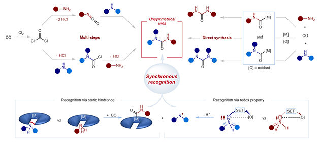 如何基于不同胺物理化學性質的細微差異,讓兩種不同胺片段找準位置,連接在同一羰基位點,一步合成非對稱脲是一個挑戰(zhàn)性難題。中國科學院蘭州化學物理研究所低碳催化與二氧化碳利用重點實驗室何林研究員團隊與武漢大學雷愛文教授團隊合作,提出了同步胺識別的概念,在鈷催化中心,當一級胺與二級胺共存時,僅有一級胺發(fā)生羰化生成?;锓N,表現出鈷物種對一級胺的選擇性識別;在銅催化中心,一級胺與二級胺與銅相互作用過程中,二級胺能夠快速生成自由基物種,表現出銅物種對二級胺的傾向性識別。首創(chuàng)性利用上述識別效應,在胺氧化羰基化一個催化反應中融合親核羰基化半反應與自由基生成轉化半反應全新反應機制,獲得了一步合成非對稱脲的獨特反應窗口。