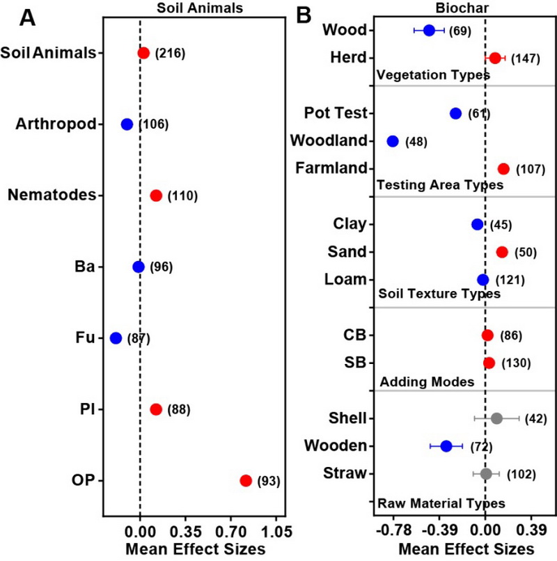 近年來(lái),全球范圍內(nèi)對(duì)生物炭作為土壤調(diào)節(jié)劑的應(yīng)用興趣顯著增加。土壤動(dòng)物在土壤生態(tài)系統(tǒng)中種類(lèi)繁多,并對(duì)土壤環(huán)境的變化表現(xiàn)出高度敏感性。它們?cè)谠u(píng)估不同田間管理?xiàng)l件和土地利用狀況下的土壤健康方面發(fā)揮著至關(guān)重要的作用。生物炭對(duì)土壤動(dòng)物的影響既包括土壤動(dòng)物的直接取食作用,也涉及生物炭對(duì)土壤環(huán)境的間接影響。然而,目前尚缺乏關(guān)于生物炭添加對(duì)土壤動(dòng)物影響的系統(tǒng)性和定量性研究。薈萃分析能夠促進(jìn)對(duì)已有研究結(jié)果的定量整合,通過(guò)整合多個(gè)發(fā)現(xiàn),尤其是在特定主題下樣本量相對(duì)較小的情況下,可以提高統(tǒng)計(jì)效率,解決研究結(jié)果間的不一致性,探討現(xiàn)有文獻(xiàn)中的發(fā)表偏差,制定新的研究問(wèn)題,并為進(jìn)一步分析研究提供理論性框架和標(biāo)準(zhǔn)化體系。