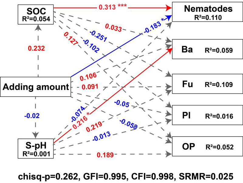 中國(guó)科學(xué)院西北高原生物研究所高寒濕地生態(tài)系統(tǒng)近自然修復(fù)與功能提升研究團(tuán)隊(duì)開(kāi)展了一項(xiàng)薈萃分析,旨在研究生物炭添加對(duì)不同處理和實(shí)驗(yàn)條件下土壤動(dòng)物的影響。結(jié)果表明:(1)生物炭的添加顯著增加了土壤動(dòng)物的豐度(0.027),并改變了其群落結(jié)構(gòu);(2)生物炭促進(jìn)了土壤線蟲(chóng)的豐度(0.124),而抑制了土壤節(jié)肢動(dòng)物的豐度(?0.101);(3)生物炭通過(guò)直接和間接途徑影響土壤動(dòng)物的豐度,其中最顯著的途徑是由土壤有機(jī)碳(SOC)和土壤pH值介導(dǎo)的。生物炭添加的數(shù)量和持續(xù)時(shí)間對(duì)不同線蟲(chóng)物種的豐度產(chǎn)生了不同的影響,最終導(dǎo)致土壤微型食物網(wǎng)結(jié)構(gòu)的改變。