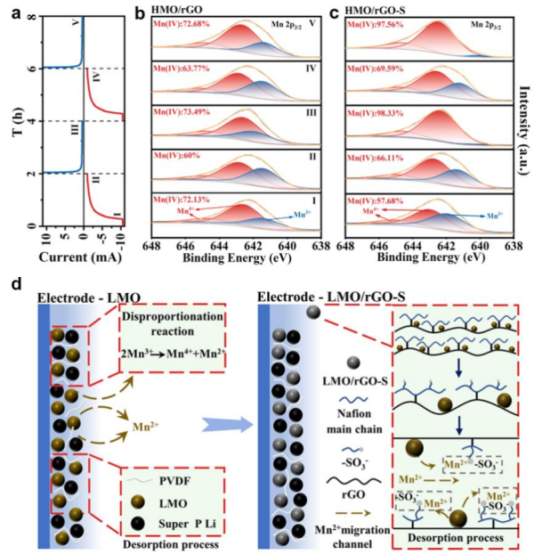除離子傳輸效率外,針對(duì)錳基電活性材料因電極極化導(dǎo)致的穩(wěn)定性較差的問題,采用還原氧化石墨烯(rGO)與Nafion協(xié)同改性的策略制備得到高效穩(wěn)定電化學(xué)吸附材料。rGO在增加材料分散性的同時(shí)大幅降低了材料極化,緩解極化過程帶來的容量衰減,使得吸附容量和循環(huán)穩(wěn)定性得到提升。研究表明Nafion通過主鏈與還原氧化石墨烯表面羧基結(jié)合,而支鏈磺酸基團(tuán)(-SO3-)可以捕獲因歧化反應(yīng)溶出的Mn2+,從而使得材料表面局部Mn2+濃度升高(圖2)。經(jīng)過協(xié)同改性,材料30次循環(huán)容量保持率由79.04%提升至94.64%。該研究驗(yàn)證了離子捕獲機(jī)制抑制歧化反應(yīng)的可行性,能夠?yàn)殄i系材料在電化學(xué)分離過程中的溶損問題提供新的解決思路(Chem. Eng. J,497?。?024) 155009)。