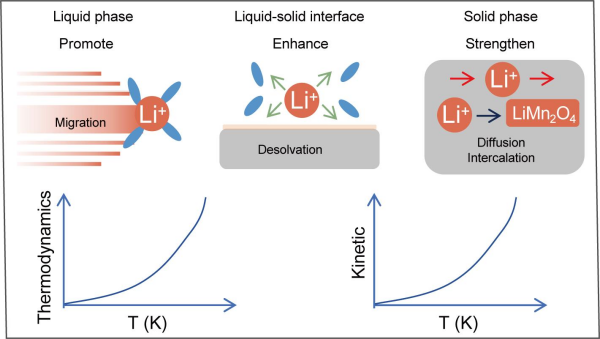在材料改性的基礎(chǔ)上,青海鹽湖研究所科研人員針對(duì)環(huán)境溫度影響電化學(xué)吸附熱力學(xué)和動(dòng)力學(xué)研究不夠深入的問題,開展了逐步升溫的策略(273.15到328.15 K),探究了溫度如何影響液相中水合離子遷移,固液界面離子脫水合和電子轉(zhuǎn)移,固相中離子擴(kuò)散等行為的熱力學(xué)和動(dòng)力學(xué)(圖3)。該研究通過升溫強(qiáng)化了熱力學(xué)和動(dòng)力學(xué),使吸附速率和吸附容量改善,且通過調(diào)節(jié)反應(yīng)參數(shù)優(yōu)化反應(yīng)速率的策略也可用于電池、催化合能源等領(lǐng)域(Sep. Purif. Technol.355?。?025) 129631)。