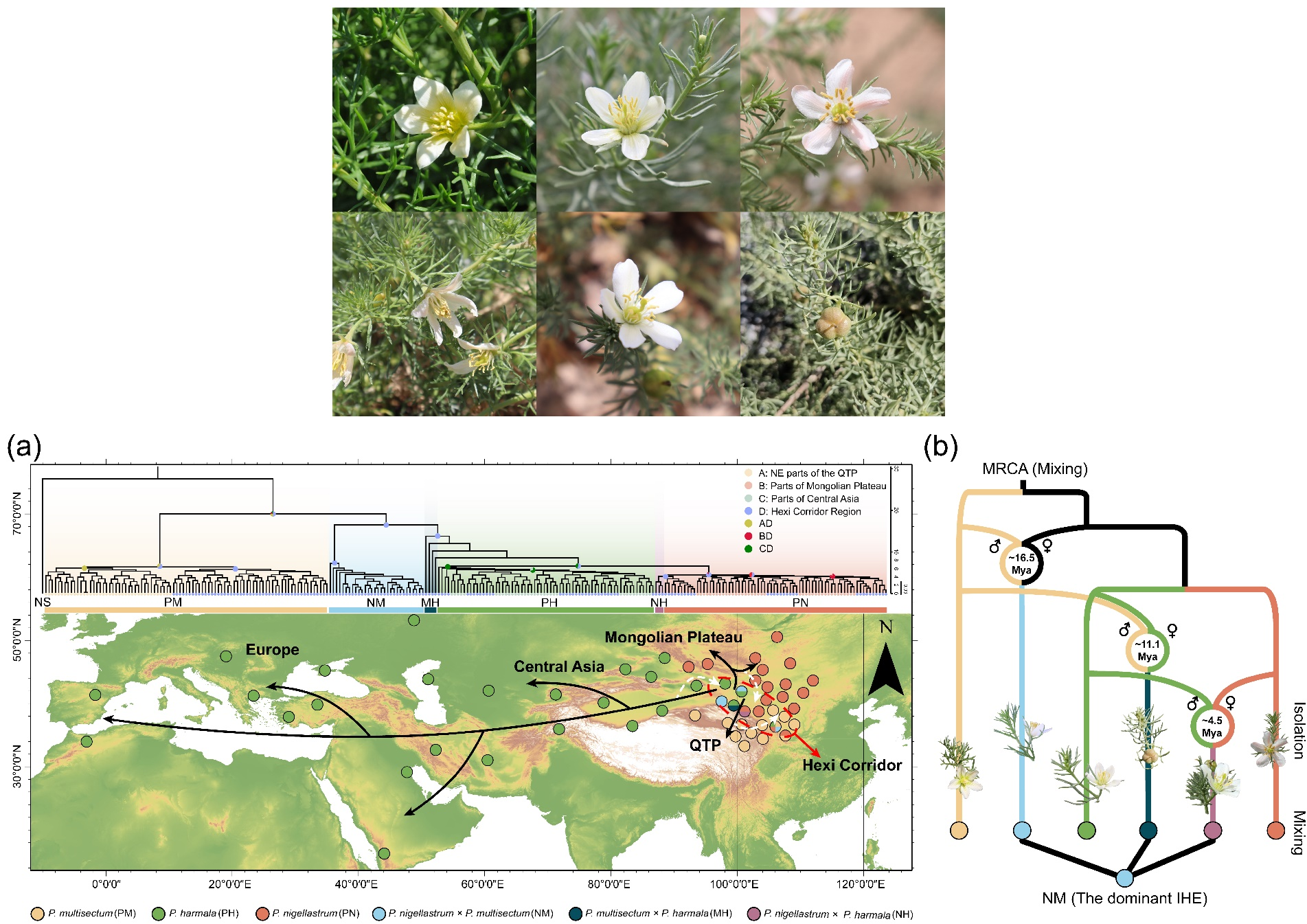 中國科學(xué)院西北高原生物研究所青藏高原植物適應(yīng)與進(jìn)化研究團(tuán)隊綜合利用Illumina二代測序、Oxford Nanopore三代測序及Hi-C互作圖譜技術(shù),成功構(gòu)建了多裂駱駝蓬的高質(zhì)量染色體水平參考基因組(2n=2x=24,基因組大小為314.37 Mb)?;谥衼喐珊祬^(qū)及其周邊地區(qū)的廣泛采樣,本研究對駱駝蓬屬及其中間形態(tài)類群的28個群體共284個個體進(jìn)行了全基因組重測序。研究結(jié)果表明,駱駝蓬屬起源于河西走廊地區(qū),通過擴(kuò)散作用和地理隔離形成了多裂駱駝蓬、駱駝蒿和駱駝蓬的異域物種形成。隨后,這些物種再次擴(kuò)散至河西走廊地區(qū),通過頻繁的基因交流演化出多種間斷雜交實體。本研究首次在中亞干旱區(qū)揭示了駱駝蓬屬的物種形成符合“混合-隔離-混合循環(huán)”(MIM cycles,Mixing-Isolation-Mixing cycles)的演化框架,解析了雜交物種形成的中間過渡階段。此外,研究發(fā)現(xiàn),間斷雜交實體通過基因交流繼承了親本的優(yōu)良性狀(如DNA損傷修復(fù)能力和抗旱適應(yīng)性),從而在自然選擇中表現(xiàn)出顯著的優(yōu)勢。通過對不同物種的轉(zhuǎn)錄組測序分析,進(jìn)一步驗證了間斷雜交實體中與適應(yīng)性進(jìn)化相關(guān)的基因存在顯著差異表達(dá)。本研究通過對中亞干旱區(qū)駱駝蓬屬的系統(tǒng)性群體遺傳學(xué)研究,揭示了其獨(dú)特的物種形成模式,為雜交物種形成中間階段的研究提供了重要的模式類群,并為物種與雜交種間的適應(yīng)性進(jìn)化機(jī)制提供了新的理論依據(jù)。