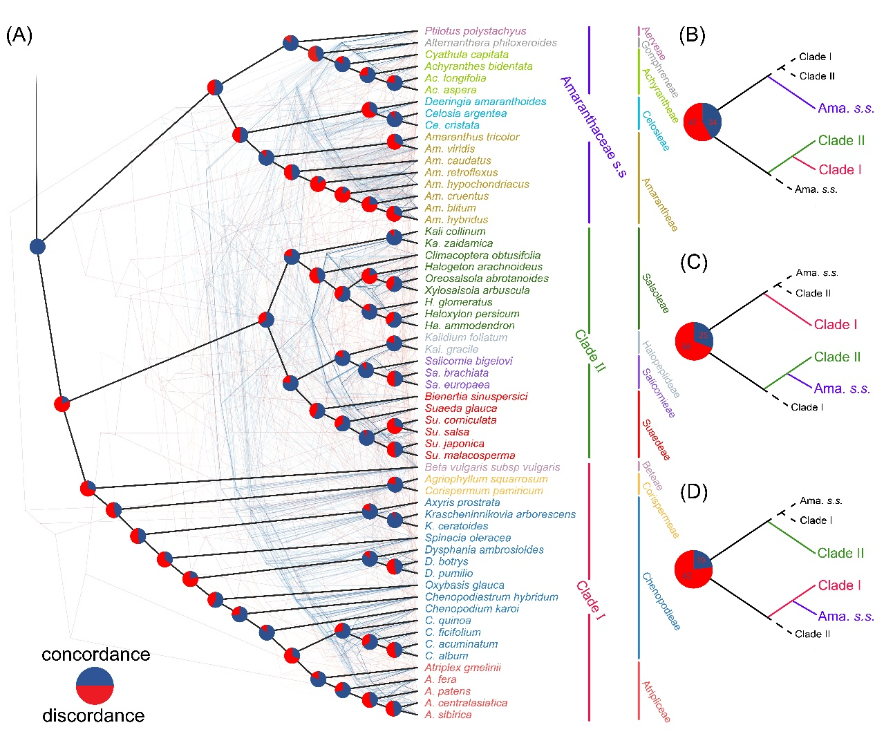 中國科學院西北高原生物研究所青藏高原植物適應與進化研究團隊綜合利用質(zhì)體基因組和全長ITS序列,重建了廣義莧科的系統(tǒng)發(fā)育關系。通過質(zhì)體基因組結構和序列比對分析,發(fā)現(xiàn)濱藜屬(Atriplex)和藜屬(Chenopodium)存在一段長約5200 bp的反向互補區(qū)域。適應性進化分析揭示了8個基因受到顯著的正選擇作用,這些基因可能在廣義莧科的進化中起到了驅動作用。系統(tǒng)發(fā)育結果表明,傳統(tǒng)藜科為單系類群,建議恢復其至科級分類學水平。對于廣義莧科的科級以下分類群,例如藜屬、鹽生草屬(Halogeton)以及豬毛菜亞族(Subtr. Salsolinae)為并系類群,建議通過建立更多的分類群或將藜族(Chenopodieae)和濱藜族(Atripliceae)合并來解決分類問題。核質(zhì)沖突及不完全譜系分選是導致廣義莧科基因樹系統(tǒng)發(fā)育不一致的主要原因。本研究為廣義莧科的系統(tǒng)發(fā)育關系提供了新的見解,并指出后續(xù)仍需采取多種數(shù)據(jù)集完善廣義莧科的分類修訂。