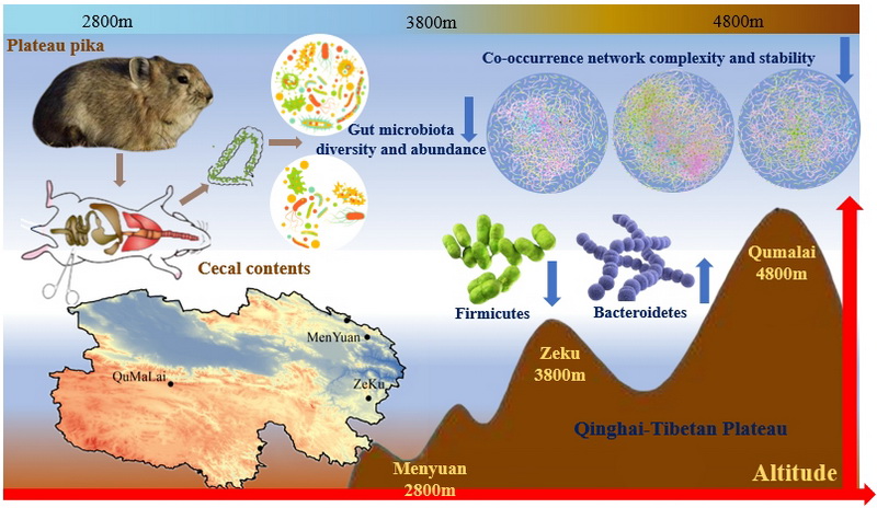 中國科學(xué)院西北高原生物研究所動物生態(tài)與資源保護研究團隊以青藏高原為研究區(qū)域,系統(tǒng)探討了高原鼠兔(Ochotona curzoniae)在不同海拔梯度下的腸道菌群結(jié)構(gòu)及功能變化。通過16S rRNA基因測序及短鏈脂肪酸(SCFA)含量分析,評估了不同海拔環(huán)境下腸道菌群的組成、功能及代謝特征。研究結(jié)果表明,隨著海拔升高,腸道菌群的α多樣性顯著下降,微生物群共現(xiàn)網(wǎng)絡(luò)的復(fù)雜性亦呈減少趨勢。然而,SCFA的含量在不同海拔間未表現(xiàn)出顯著差異,表明高原鼠兔對SCFA的產(chǎn)生和需求可能已趨于穩(wěn)定。此外,微生物群落結(jié)構(gòu)隨海拔變化呈現(xiàn)適應(yīng)性調(diào)整的趨勢,具體表現(xiàn)為擬桿菌門相對豐度的顯著上升,而厚壁菌門的比例則顯著下降。進一步分析微生物群落的組裝機制發(fā)現(xiàn),隨海拔升高,群落組裝過程逐漸趨于確定性,表明環(huán)境篩選在高海拔條件下對微生物群落的塑造作用增強。KEGG通路分析揭示,高原鼠兔腸道菌群在代謝、遺傳信息處理及有機體系統(tǒng)相關(guān)通路上呈現(xiàn)顯著上調(diào)趨勢。高原鼠兔腸道菌群可能通過調(diào)控代謝途徑及富集適應(yīng)高原環(huán)境的微生物種群,以幫助宿主應(yīng)對極端的高海拔生態(tài)壓力。本研究強調(diào)了腸道菌群在動物適應(yīng)極端環(huán)境中的關(guān)鍵作用,揭示了海拔對腸道菌群組成與功能的影響,為理解動物如何通過微生物機制適應(yīng)高海拔環(huán)境提供了科學(xué)依據(jù)。研究成果不僅對高原鼠兔的生態(tài)適應(yīng)研究具有重要意義,也為其他極端環(huán)境物種的研究提供了參考。
