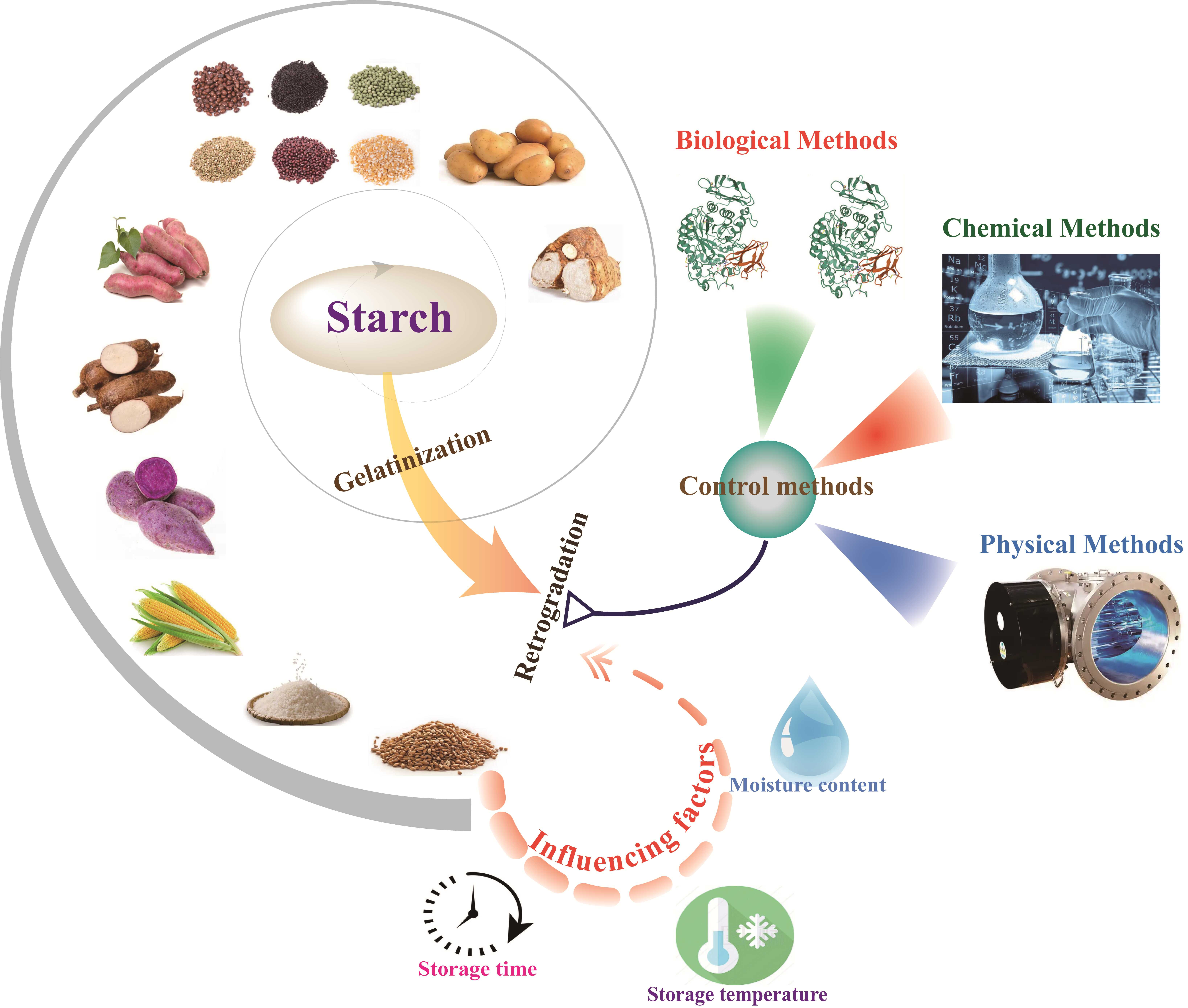 文章探討了物理、化學(xué)和生物三種抑制淀粉回生的關(guān)鍵方法。物理方法包括控制儲(chǔ)存溫度、調(diào)節(jié)水分含量、高壓處理、輻照處理、超聲處理以及干燥和冷卻等,這些方法通過(guò)改變淀粉分子的環(huán)境或減少分子間相互作用來(lái)抑制淀粉的回生?;瘜W(xué)方法通過(guò)添加特定的化學(xué)物質(zhì)來(lái)抑制淀粉回生,如添加糖類、蛋白質(zhì)、脂類、鹽類、多酚類化合物等,這些物質(zhì)可與淀粉分子形成復(fù)合物,從而阻止淀粉分子的重結(jié)晶。生物方法主要通過(guò)酶的作用來(lái)分解淀粉分子,減少其回生傾向,例如,α-淀粉酶和β-淀粉酶可有效抑制淀粉的回生。