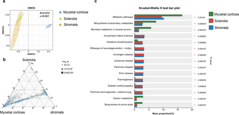 中國科學院西北高原生物研究所青藏高原植物適應與進化研究團隊研究鑒定出4,561個細菌OTU,其中2980個為稀有類群(相對豐度<0.01%)。宏基因組分析顯示,外部菌絲皮層富集576個代謝通路(如碳代謝、次級代謝產(chǎn)物合成),顯著高于菌核(117個)和子座(0個)。稀有類群雖豐度低,但貢獻了關(guān)鍵物質(zhì)循環(huán)基因(如氮代謝基因narG、nosZ),提示其具有“功能庫”作用。共現(xiàn)網(wǎng)絡分析揭示,外部菌絲皮層微生物呈現(xiàn)獨特的模塊化結(jié)構(gòu),Proteobacteria和Bacteroidetes形成高連接度核心網(wǎng)絡。該區(qū)域特異性富集Caballeronia、Dyella等具有降解功能的細菌屬,可能在昆蟲幼蟲分解和宿主防御中發(fā)揮屏障作用。通過優(yōu)化培養(yǎng)組培養(yǎng)體系,成功分離52株細菌(覆蓋26屬40種),包括8個高通量測序未檢出的菌株(如Plantibacter、Tardiphaga)。81.2 %的目級類群實現(xiàn)可培養(yǎng),為后續(xù)功能驗證和資源利用奠定基礎(chǔ)。