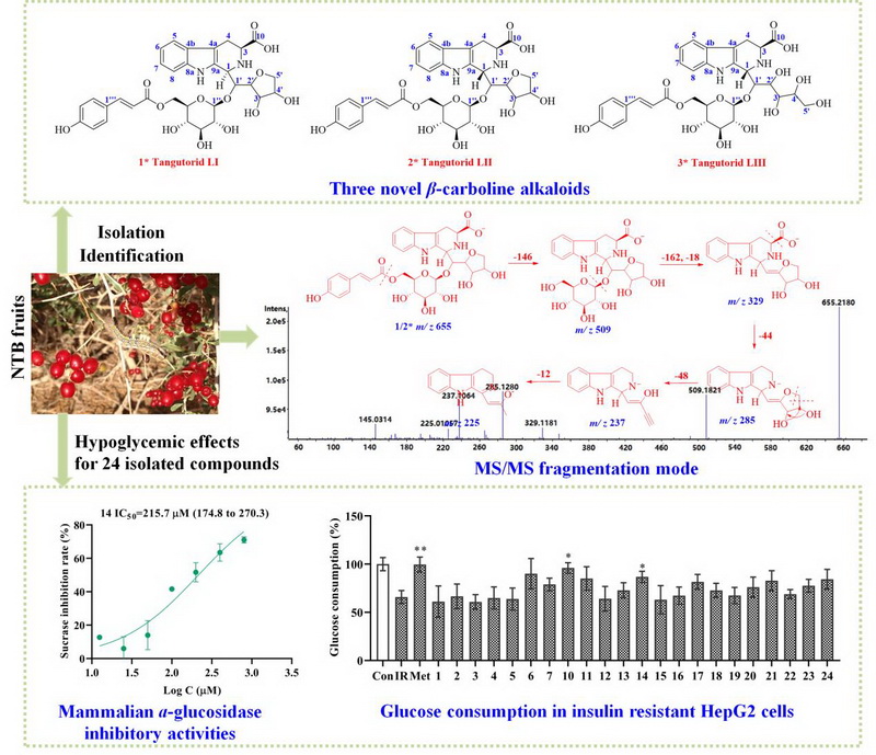 相關(guān)研究結(jié)果以?Tentative characterization of three novel coumaroyl glucoside β-carboline alkaloids and discovery of hypoglycemic compounds from Nitraria tangutorum Bobr. Fruit?為題,于3月27日在?Food Chemisty?(中國科學(xué)院1區(qū),影響因子8.5)在線發(fā)表。西北高原所岳會蘭研究員為第一作者和通訊作者。該工作得到了青海省中央引導(dǎo)地方項(xiàng)目(2025ZY008)的資助和支持。