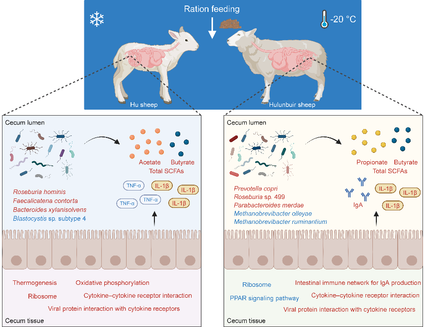 近期,中國科學(xué)院西北生態(tài)環(huán)境資源研究院畜牧團隊聯(lián)合山東省農(nóng)業(yè)科學(xué)院、黃三角生物遺傳與分子精準育種實驗室和黃河口生物精準營養(yǎng)研發(fā)中心,以呼倫貝爾羊(耐寒型)與湖羊(低溫敏感型)為研究對象,通過構(gòu)建綿羊冷慢性應(yīng)激模型,結(jié)合限飼控制,系統(tǒng)解析了盲腸微生物群落、代謝產(chǎn)物及宿主轉(zhuǎn)錄組的協(xié)同響應(yīng)機制。
