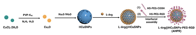 近日,中國科學院蘭州化學物理研究所天然藥物與化學測量研究中心海軍人才團隊與新疆大學合作,針對傳統(tǒng)抗腫瘤藥物遞送系統(tǒng)的局限性,發(fā)展了一種“高效靶向+刺激響應+光熱協(xié)同”智能響應抗腫瘤藥物遞送材料。研究人員通過將一氧化氮供體L-精氨酸(L-Arg)負載到具有近紅外吸收的中空硫化銅納米顆粒(HCuSNPs)中,并與腫瘤靶向肽(RGD)組裝,合成AHPR智能納米遞送材料。體外和體內(nèi)實驗表明,近紅外光激發(fā)下AHPR產(chǎn)生熱效應,誘導納米結構降解并釋放銅離子和一氧化氮,提高血管通透性,促進藥物深度滲透。同時,協(xié)同觸發(fā)光熱治療、銅死亡及活性氧/活性氮風暴,實現(xiàn)高效抗腫瘤效果(體積減少90%)。