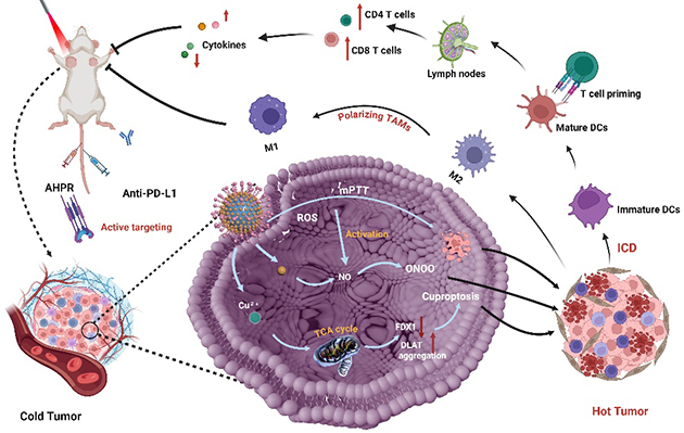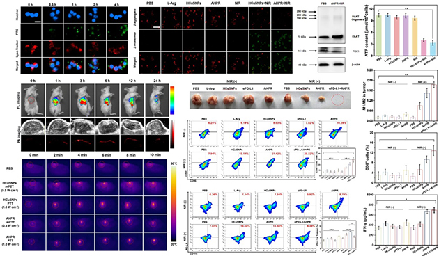 研究人員進一步利用熒光-光聲成像可視化技術,揭示了智能響應抗腫瘤藥物遞送體系的作用機制。結果表明,AHPR組裝腫瘤靶向肽,可主動識別并富集于腫瘤部位,實現(xiàn)高效靶向遞送。并在近紅外光激發(fā)下,通過溫和光熱、銅死亡和ONOO?產(chǎn)生等機制調控腫瘤免疫微環(huán)境,促進DCs成熟,增強T細胞的浸潤和巨噬細胞極化,誘導免疫原性細胞死亡,將“冷”腫瘤轉化為“熱”腫瘤。值得注意的是,AHPR可與免疫檢查點抑制劑(αPD-L1) 結合,進一步增強免疫應答率,改善腫瘤治療效果。這一策略為抗腫瘤藥物智能遞送材料開發(fā)和多維腫瘤免疫治療提供了新思路。