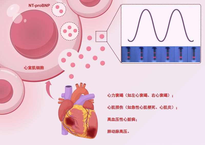 心臟在心力衰竭時,心肌細胞釋放NT-proBNP后被試劑盒通過時間分辨熒光系統(tǒng)檢出的示意圖
