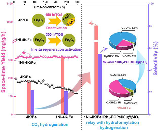 系統(tǒng)研究表明,在K-Ni共修飾的Fe催化劑中,K-Ni之間的協(xié)同作用機制顯著提升了C2+OH生成的時空收率,Ni的引入促進了*CHx中間體形成,K的存在能抑制*CHx深度加氫,二者協(xié)同增強了*CO-*CHx偶聯(lián)。同時,KNi的引入能夠加速活性相Fe5C2的生成與原位再碳化,因此,在表現(xiàn)出高活性的同時,還展示出較好的使用穩(wěn)定性。