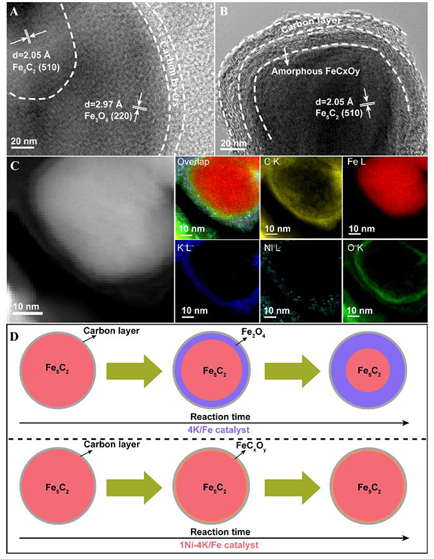 3.反應后4K/FeA)和4K-1Ni/FeB)催化劑的HRTEM結果;(C)反應后4K-1Ni/Fe催化劑EELS元素分布;(D4K/Fe4K-1Ni/Fe催化劑的結構演變。