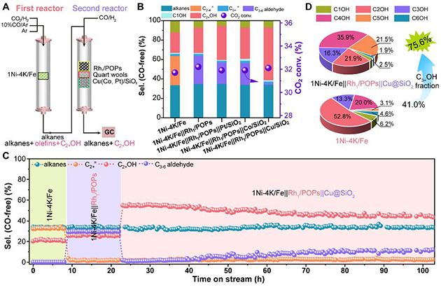中國科學院蘭州化學物理研究所低碳催化與二氧化碳利用全國重點實驗室可再生碳資源催化轉化組在前期Ni催化CO2加氫合成C2+OHAngew. Chem. Int. Ed.,2023,DOI: https://doi.org/10.1002/anie.202311335.)和多相催化烯烴氫甲?;铣扇?/span>J. Catal. 2025,DOI: 10.1016/j.jcat.2025.116095;J. Org. Chem,2023,DOI:?10.1021/acs.joc.2c02105等)的研究基礎上,研究人員一方面構建了Ni-K共修飾的Fe基催化劑(1Ni-4K/Fe),將CO2加氫生成C2+OH的時空收率(STY)提高到317.0 mg/g/h,并且能在300h內穩(wěn)定運行;另一方面利用接力催化思想,構建了“CO2加氫-烯烴氫甲酰化-醛氫化”(1Ni-4K/Fe||Rh1/POPs||Cu@SiO2)的三串聯(lián)體系,將產物中烯烴進一步轉化為醇,實現(xiàn)C2+OH的時空收率達到980.5 mg/g/h,選擇性可達55.0%,而且由于氫甲?;脑鎏甲饔?,C2+OH中C3+OH的占比可達75.6%,顯著提升碳的利用率。