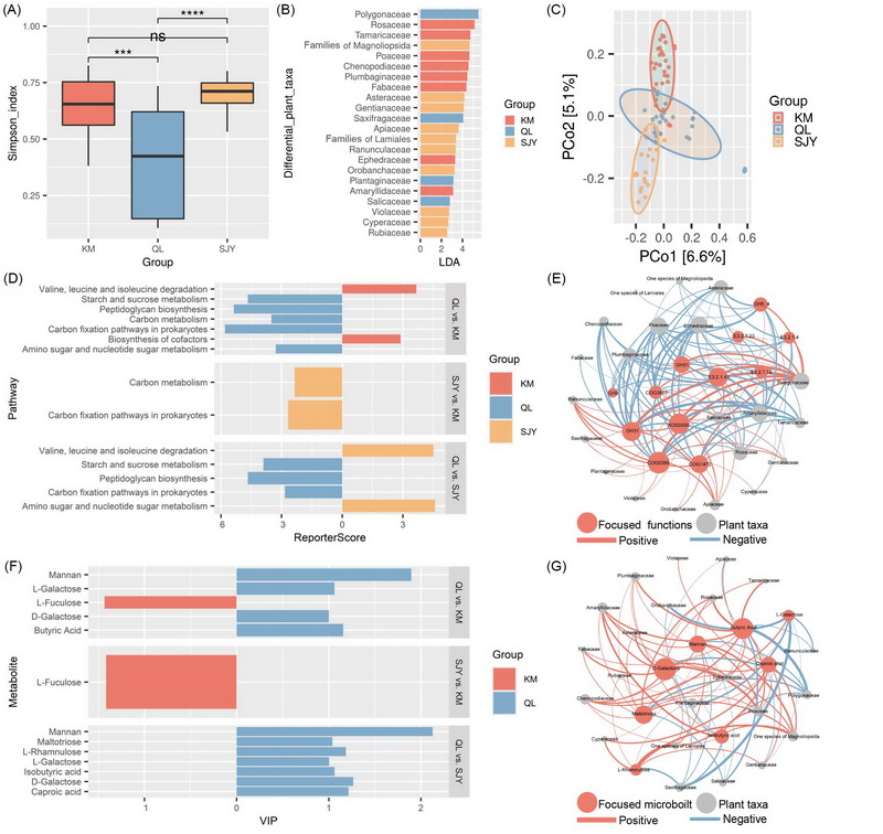 中國科學(xué)院西北高原生物研究所動物生態(tài)與資源保護研究團隊在青藏高原青海湖流域、昆侖山及三江源三大典型區(qū)域采集了巖羊的新鮮糞便樣本,利用trnL植物DNA條形碼技術(shù)、宏基因組測序技術(shù)和非靶向代謝組學(xué)技術(shù),構(gòu)建了巖羊食性 - 微生物 - 代謝物多組學(xué)關(guān)聯(lián)分析框架,深入解析了巖羊在青藏高原不同區(qū)域的食性差異、腸道微生物組成與功能特征及其代謝產(chǎn)物差異,探索了食性結(jié)構(gòu)與微生物共生系統(tǒng)的協(xié)同變異規(guī)律,揭示了宿主 - 微生物共生系統(tǒng)在區(qū)域適應(yīng)中的協(xié)同進化模式。