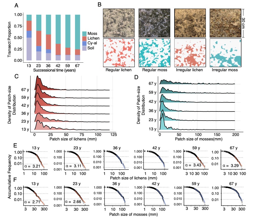 研究團(tuán)隊(duì)采用了計(jì)算建模與全局-局部耦合的野外調(diào)查相結(jié)合的研究方法。理論建模基于概率的元胞自動(dòng)機(jī)(Cellular automaton)模型的開發(fā),模擬了地衣和蘚類斑塊的動(dòng)態(tài)變化。野外觀測(cè)在中國(guó)科學(xué)院沙坡頭沙漠試驗(yàn)研究站進(jìn)行,通過在不同演替階段的人工固沙植被帶中設(shè)置樣線,記錄了生物結(jié)皮的覆蓋度、組成和斑塊大小分布。研究通過對(duì)冪律分布的擬合,從全局尺度檢測(cè)主導(dǎo)生物結(jié)皮動(dòng)態(tài)的反饋模式。通過不同演替階段和不同斑塊大小下生物結(jié)皮斑塊中心與邊緣之間的生長(zhǎng)差異比較,從斑塊尺度驗(yàn)證局部自組織過程,對(duì)比模擬結(jié)果揭示了生物結(jié)皮自組織機(jī)理及其生態(tài)意義。