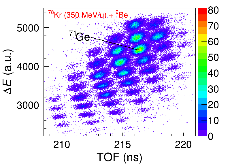 RIBLL2-F4終端建成后,研究團(tuán)隊(duì)利用400 MeV/u的氬-40束流與350 MeV/u的氪-78束流開展了兩輪實(shí)驗(yàn),測(cè)試了該實(shí)驗(yàn)終端的整體性能,清晰鑒別了實(shí)驗(yàn)過程中產(chǎn)生的次級(jí)束種類。以350 MeV/u-78束流轟擊10 mm厚鈹靶產(chǎn)生的鍺-71為例,其電荷分辨約為0.2,質(zhì)荷比分辨約為5ⅹ10-3。這一結(jié)果表明,RIBLL2整條束線對(duì)中等質(zhì)量區(qū)束流的彈核碎裂產(chǎn)物已具備較好的粒子鑒別能力。新建的RIBLL2-F4終端在實(shí)驗(yàn)中運(yùn)行穩(wěn)定可靠,已具備開展電荷改變截面測(cè)量等放射性束物理實(shí)驗(yàn)的條件。