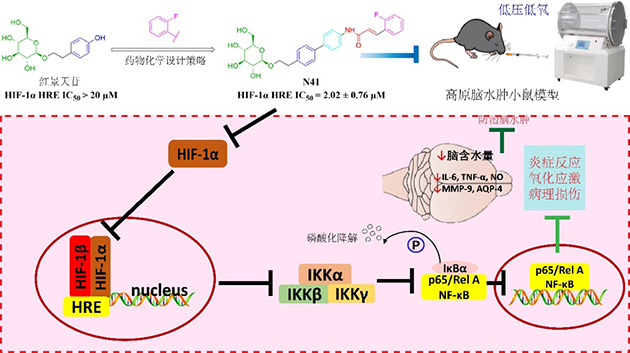 研究團(tuán)隊(duì)聚焦高原腦水腫防治重大問(wèn)題,以高原特色中草藥紅景天中的活性成分紅景天苷為結(jié)構(gòu)基礎(chǔ),基于骨架躍遷和分子雜合的藥物設(shè)計(jì)策略,通過(guò)引入鄰氟苯基HIF-1α抑制劑藥效團(tuán),對(duì)紅景天苷的糖苷鍵、連接鏈、芳環(huán)取代基等三個(gè)部分進(jìn)行結(jié)構(gòu)修飾,設(shè)計(jì)并合成了多種紅景天苷衍生物開(kāi)展構(gòu)效關(guān)系研究。通過(guò)雙熒光素酶報(bào)告基因、細(xì)胞毒、ELISA等實(shí)驗(yàn),篩選獲得強(qiáng)活性化合物N41,可顯著抑制HIF-1α HRE轉(zhuǎn)錄(IC50: 2.02 ± 0.76 μM),減少C8-D1A細(xì)胞炎癥因子IL-6和NO的表達(dá)以及ROS積累,減輕氧化損傷且無(wú)明顯細(xì)胞毒性。HACE小鼠模型研究發(fā)現(xiàn),N41可有效降低HACE模型小鼠腦含水量,改善缺氧導(dǎo)致的腦組織損傷,通過(guò)阻斷HIF-1α/IKKα/NF-κB信號(hào)通路,抑制下游TNF-α、IL-6等炎癥因子及MMP-9、AQP-4等血腦屏障通透性相關(guān)因子表達(dá),緩解炎癥反應(yīng)和維持血腦屏障完整性,發(fā)揮高原腦水腫防治功效。相關(guān)研究成果發(fā)表在European Journal of Medicinal Chemistry(2025,297: 117982)上。