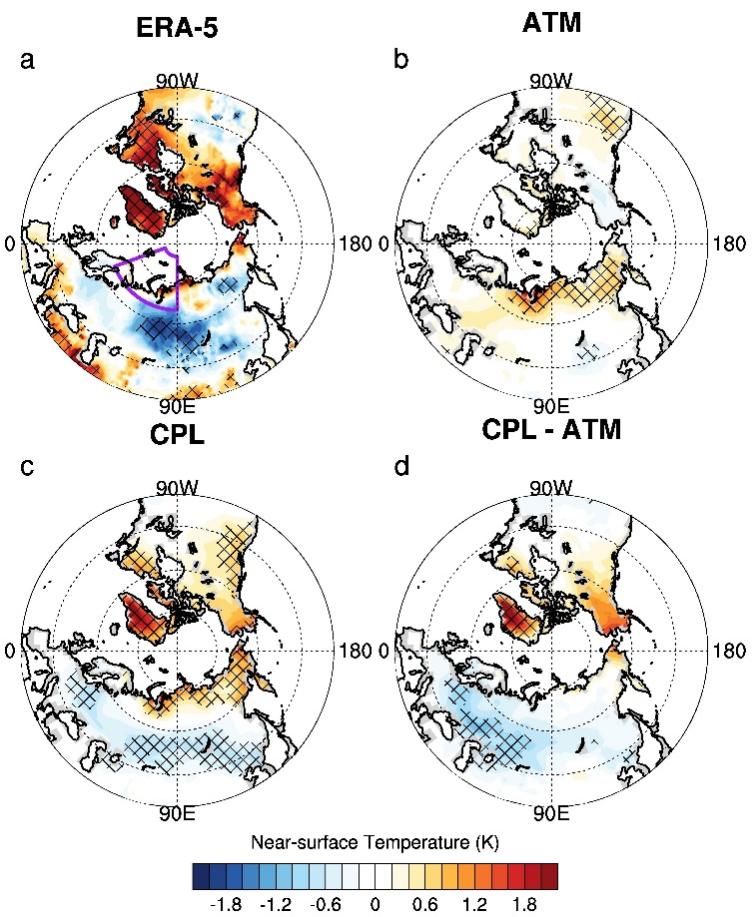 從ERA-5再分析資料(a)、僅考慮大氣過(guò)程的大氣模式試驗(yàn)(b)及包含海-氣耦合過(guò)程的全耦合模式試驗(yàn)(c)得到的歷史時(shí)期海冰消融導(dǎo)致的冬季地表氣溫異常(K)。(d)為全耦合模式試驗(yàn)與大氣模式試驗(yàn)結(jié)果之差