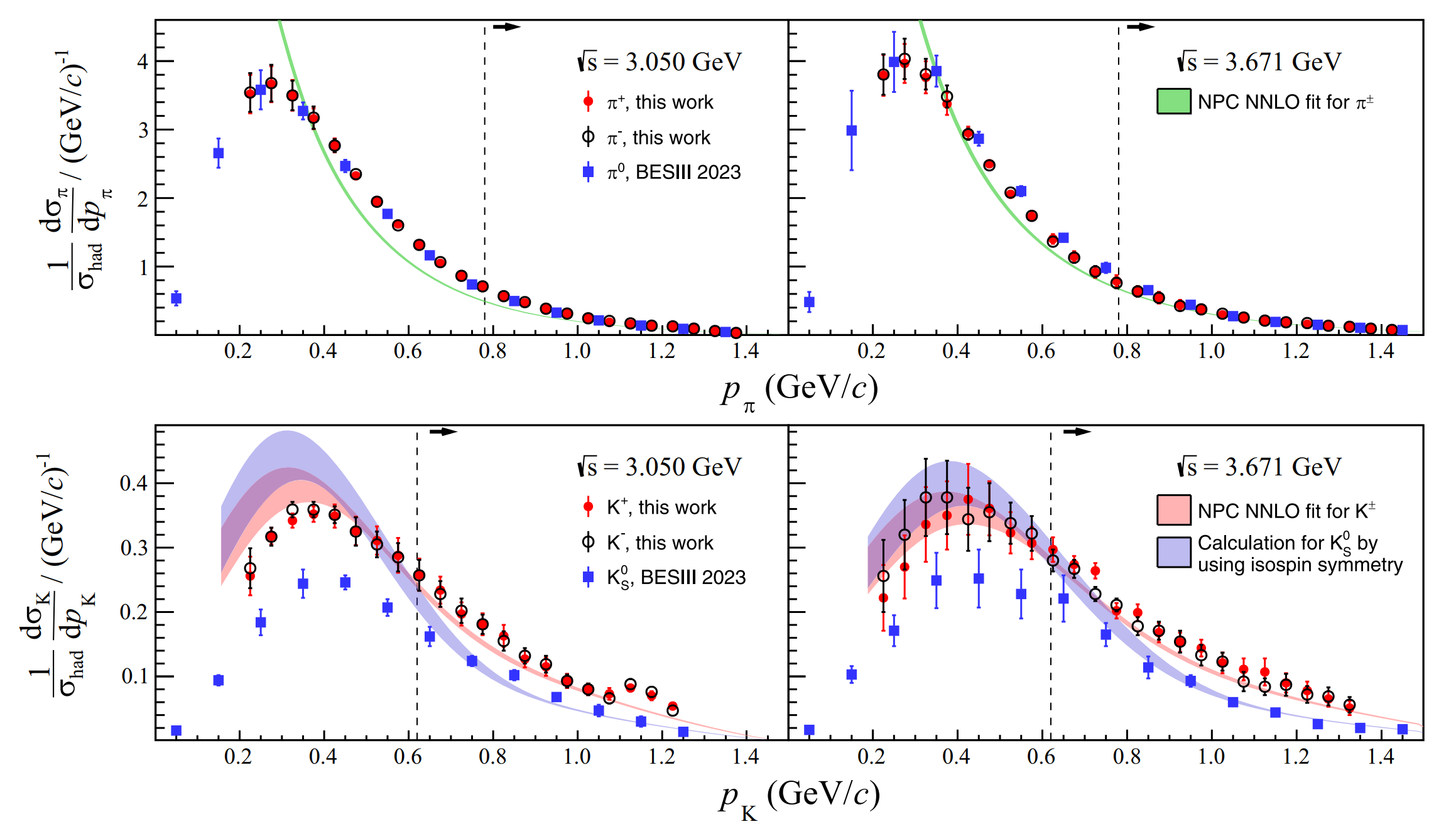 面對(duì)這一挑戰(zhàn),團(tuán)隊(duì)利用北京譜儀(BESIII)能量掃描數(shù)據(jù),精確測(cè)量了帶電pion和Kaon介子單舉產(chǎn)生微分截面,最高精度達(dá)1%~2%。結(jié)合NPC合作組(Non-perturbative Physics Collaboration)的全局?jǐn)?shù)據(jù)擬合研究,這一新的測(cè)量結(jié)果與基于次次領(lǐng)頭階(NNLO)精度的量子色動(dòng)力學(xué)(QCD)理論分析相符合,尤其是大動(dòng)量強(qiáng)子區(qū)域(如圖2所示)。該研究成果為檢驗(yàn)低能區(qū)QCD因子化定理及部分子碎裂過(guò)程中同位旋對(duì)稱性的有效性提供了有力的實(shí)驗(yàn)支持,對(duì)深入理解強(qiáng)相互作用動(dòng)力學(xué)具有重要意義。